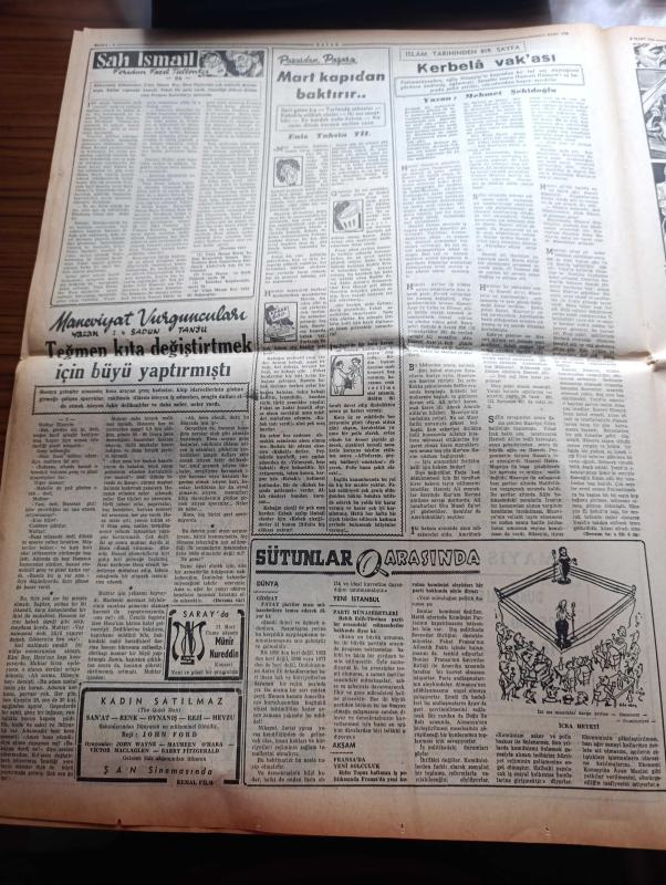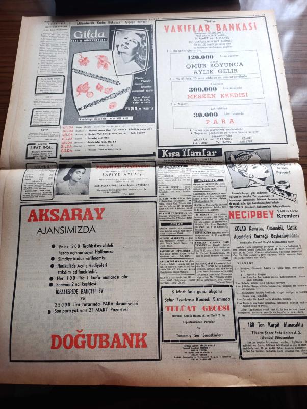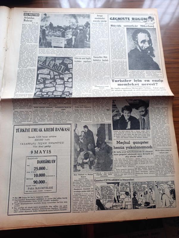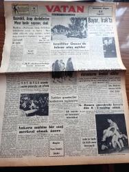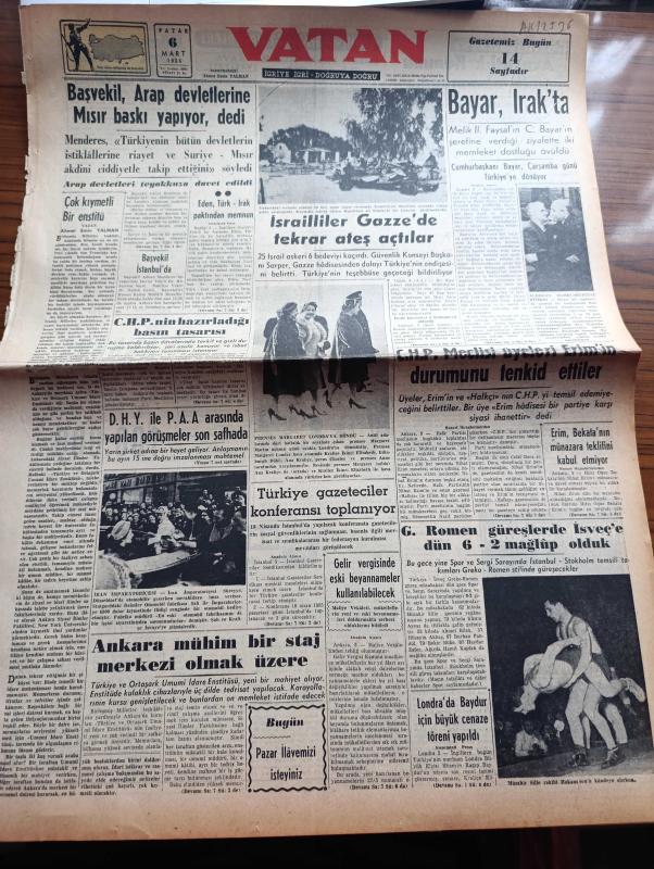 Vatan Gazetesi - Turkish Newspaper - 6 Mart 1955 - çok kıymetli bir enstitü yazan Ahmet Emin Yalman Başmakale - başvekil Adnan Menderes Arap devletlerine Mısır baskı yapıyor dedi - israilliler gazzede tekrar ateş açtılar fotoğraf - Celal Bayar Irak'ta - CHP meclis üyeleri Nihat Erim'in durumunu tenkit ettiler - grekoromen güreşlerde isveç'e dün 6 2 mağlup olduk - Hanımın çiftliği yazan Orhan Kemal Yazı Dizisi - Avrupa Birliği mevzuunda münazara - gençliğin Atatürk'e cevabı müsabakası geri bırakıldı - geçmişte bugün büyük sanatkar Mikelanj yazan Feridun Fazıl Tülbentçi - Şah İsmail yazan Feridun Fazıl Tülbentçi Yazı Dizisi - Kerbela vakası yazan Mehmet Şehitoğlu - son beste filmi oynayanlar Zeki Müren Belgin Doruk Sümer İnci ve Taksim sinemasında - Kadın severse filmi oynayanlar Muzaffer Tema Gülistan Güzey Elhamra Bulvar ve Turan sinemalarında - Zeki Müren fotoğraf - İstanbul sinema tiyatro programı - Ankara İstanbul İzmir Teknik Üniversite radyo programı - Safiye Ayla Tepebaşında adlı eser, Kitap > Süreli Yayınlar > Gazeteler > Türkiye > Genel > Günlük kategorisinde İkinci El olarak satıştadır.