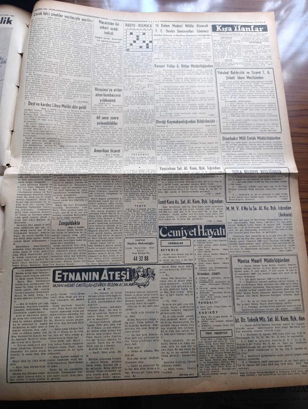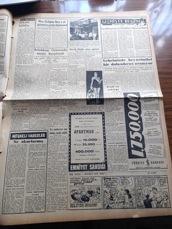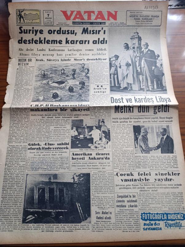 Vatan Gazetesi - Turkish Newspaper - 7 Ağustos 1956 - bozuk bir nizam yazan Ahmet Emin Yalman Başmakale - Suriye ordusu Mısır'ı destekleme kararı aldı - Irak Süveyş işinde mısır'ı destekliyor - CHP genel başkanı İsmet İnönü Heybeliada plajı'nda sırtüstü yüzerken fotoğraf - Libya Meliki ve Cumhurreisi Celal Bayar İstiklal marşlarını dinliyorlar fotoğraf - İlhami Civanoğlu rektör seçildi fotoğraf - çocuk felci sinekler vasıtasıyla yayılır - Kasım Gülek Ulus gazetesi sahibi olarak ifade verecek - Suçlu yazan Orhan Kemal Yazı Dizisi - geçmişte bugün yazan Feridun Fazıl Tülbentçi Yazı Dizisi - Osman Bölükbaşı Giresun'da sessiz karşılandı - Siyasi hatıralar yazan General Ali Fuat Cebesoy Yazı Dizisi - Bir Akdeniz yolculuğunun resimlerle röportajı röportajı yapan Foto Hilmi Şahenk - İspanya'da dans eden bir kadın fotoğraf - Emniyet Müdürü muavini Necdet Uğur Venedikte fotoğraf - Amerikan Ticaret heyeti Ankara'da - CHP İl Başkanı Muhlis Sırmalı'nın idari makamlara bir şikayeti fotoğraf adlı eser, Kitap > Süreli Yayınlar > Gazeteler > Türkiye > Genel > Günlük kategorisinde İkinci El olarak satıştadır.