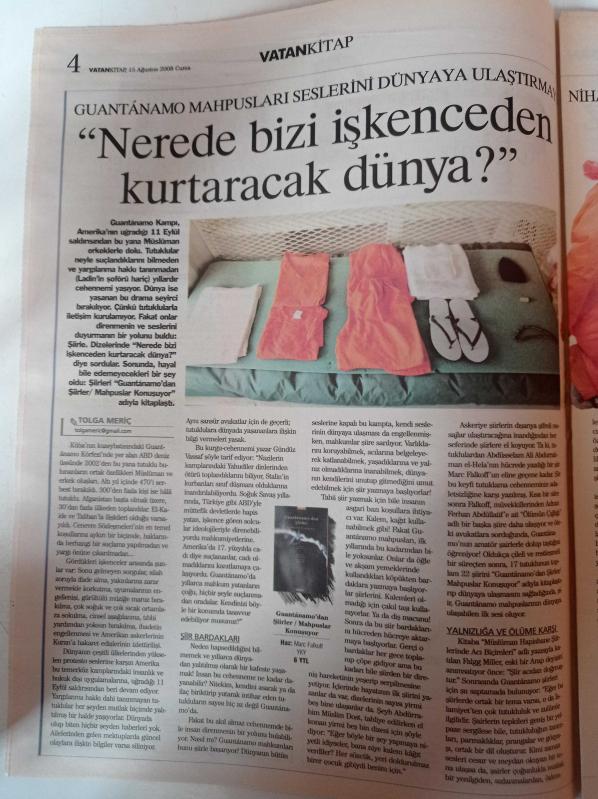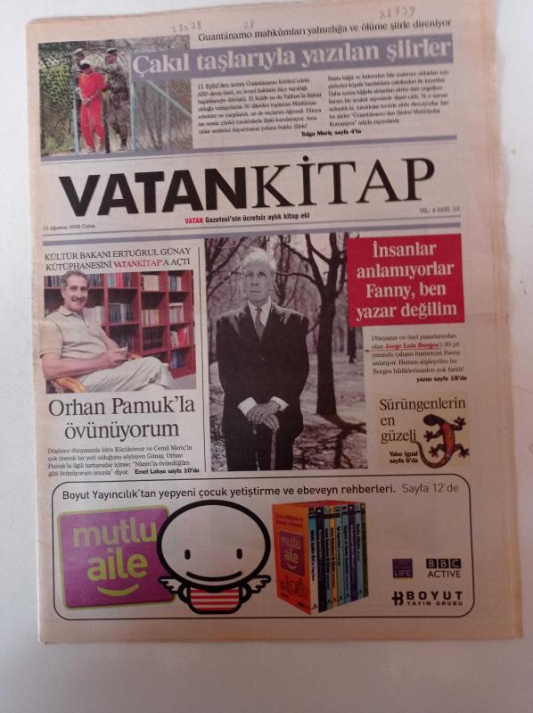 Vatan Kitap Gazetesi - 15 Ağustos 2008 - Sayı 53 - Kültür Bakanı Ertuğrul Günay Orhan Pamukla Övünüyorum - Jorge Luis Borges Fotoğrafı - Çakıl Taşlarıyla Yazılan Şiirler - Sürüngenlerin En Güzeli - Guantanamo adlı eser Türkçe dilindedir.