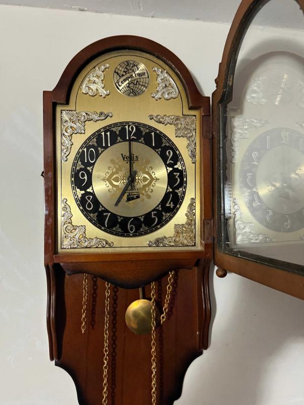 Velis Quartz Ahşap Sarkaçlı Duvar Saati 1970–1980’li yıllarda popüler olan klasik Alman tarzı “Regulator” Velis Quartz ahşap sarkaçlı duvar saati, temiz durumda ve orijinal parçaları (sarkaç, zincir, cam kapak) Çalışır durumda