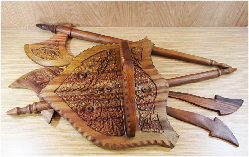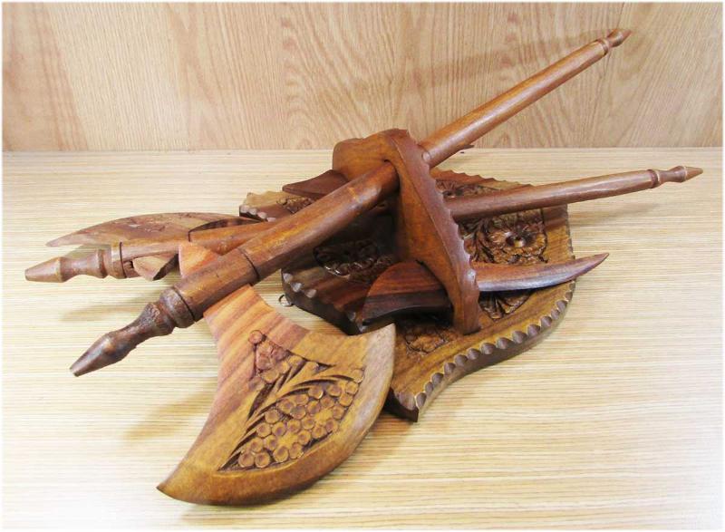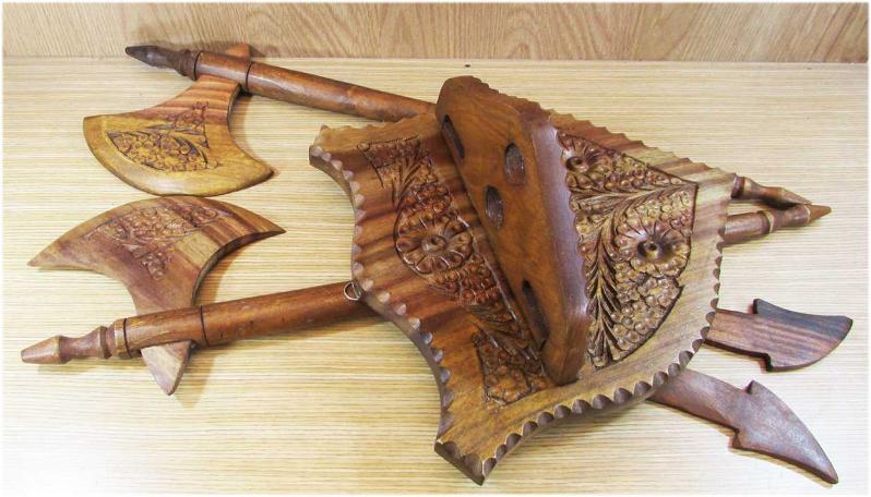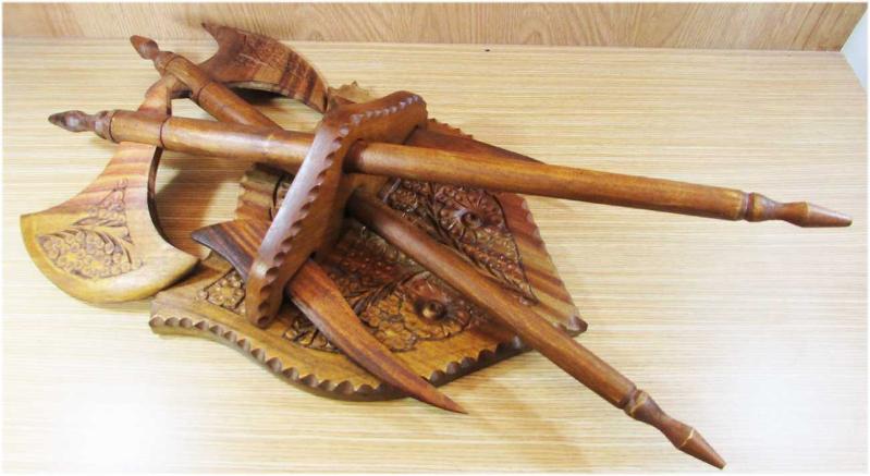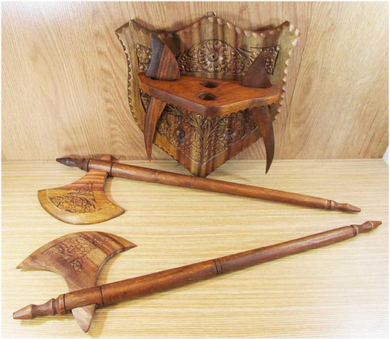 DUVARDA RESİMLEYEMEDİK, AVRUPA MENŞEİLİ ÇOK GÜZEL EL OYMA AHŞAP DUVAR SÜSÜ, BİR KAİDE,İKİ BALTA VE İKİ BIÇAKTAN OLUŞUYOR, SAĞLAM VE TERTEMİZ, MONTAJLI DURUMDA YAKLAŞIK YÜKSEKLİĞİ 50-55cm