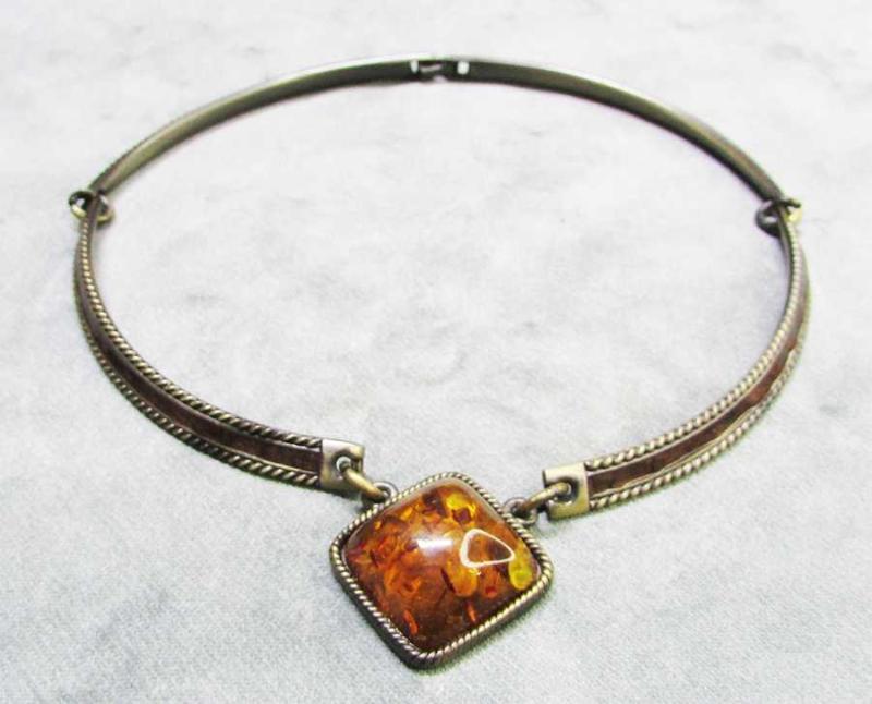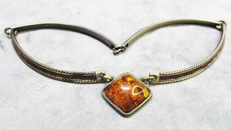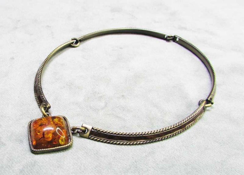 VİNTAGE, ERİTME POLONYA KEHRİBAR MADALYONLU, BRONZ ÜZERİ ESKİTME GÜMÜŞ KAPLAMA YAPILI, İLGİNÇ VE GÜZEL TASMA MODEL KOLYE, SAĞLAM VE TEMİZ, KUŞAK GENİŞLİĞİ 7mm,UZUNLUĞU 39-40cm, UÇ YÜKSEKLİĞİ 3cm