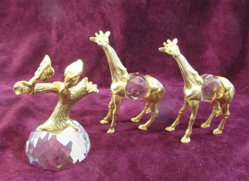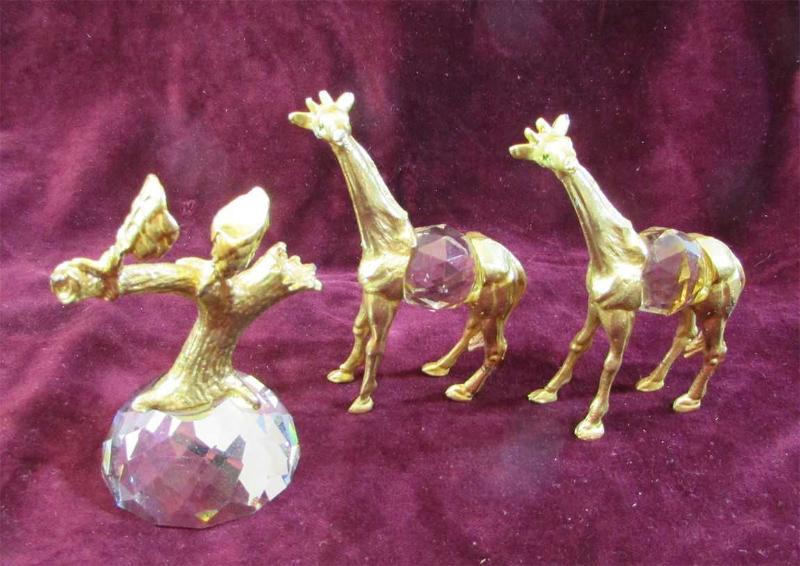 VİNTAGE 3 ADET DEKORLUK OBJE KRİSTAL CAM VE METAL ÜZERİ ALTINVERMEYLİ ZÜREFA VE AĞAÇ DALI FİGÜRLERİ HACİMLERİNE GÖRE AĞIR YAPILILAR SAĞLAM VE TEMİZLER EBATLARI 7,5cmx9,5cm