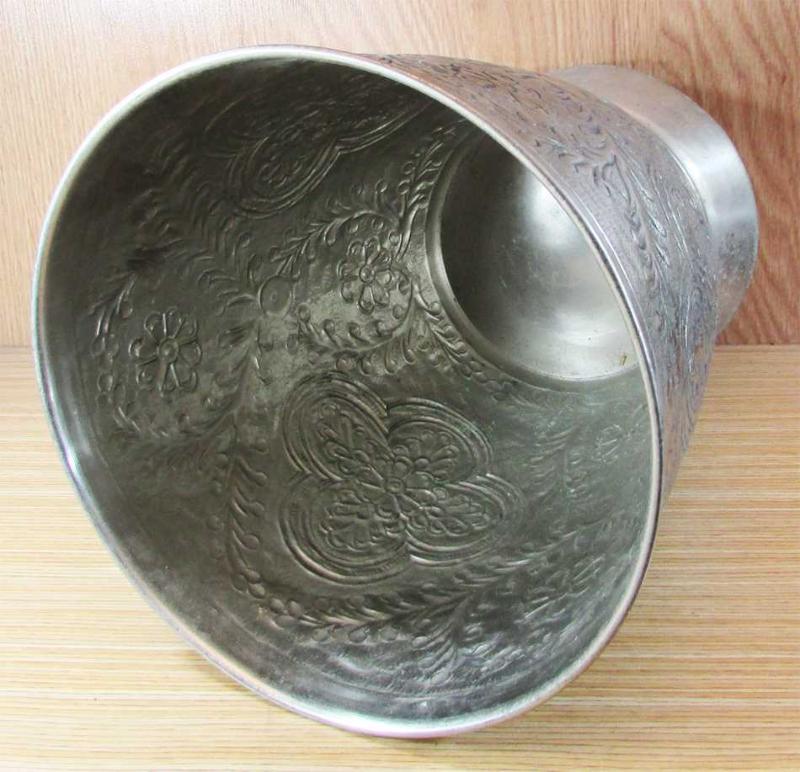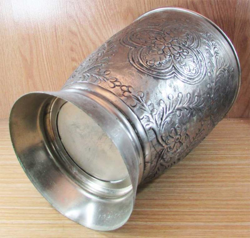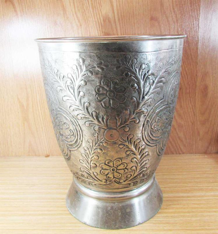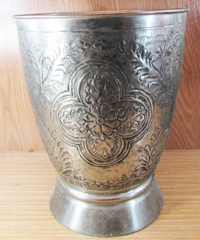 VİNTAGE İTHAL MENŞEİLİ, HARİKA GOFRE KABARTMA İŞÇİLİKLİ,KALIN VE DOLGUN YAPILI, PİRİNÇ YA DA BAKIR ÜZERİ GÜMÜŞ KAPLAMA BÜYÜK VAZO-ÇİÇEKLİK, MEVCUDU İLE SAĞLAM VE TEMİZ, OVULUP PARLATILIRSA ÇOK DAHA GÜZEL OLUR, TABAN GENİŞLİĞİ 16,5cm,AĞIZ ÇAP GENİŞLİĞİ 21,5cm, YÜKSEKLİĞİ 27cm