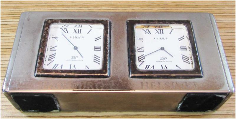 KOLEKSİYONLUK, 2000 MİLENYUM YILI İÇİN, İNGİLİZ "LİNKS OF LONDON" FİRMASI TARAFINDAN YAPILMIŞ, İKİ GÖSTERGELİ VE PİLLİ MASA SAATİ, KASASI GÜMÜŞ KAPLAMA,SAAT MEKANİZMA ÇERÇEVELERİ GÜMÜŞTEN, ÇALIŞIR VAZİYETTE AMA PİLLERİNİN YENİLENMESİ LAZIM,DETAYLARI ÜRÜN RESİMLERİNDE, KASA KALINLIĞI 2,5cm,YÜKSEKLİĞİ 5,5cm,UZUNLUĞU 11cm,