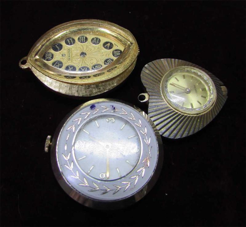 VİNTAGE, 1960 LARDAN İSVİÇRE İMALATI, 3 ADET KURMALI KOLYE SAATLER, SAATLER ÇALIŞMIYOR,TAMİR VE BAKIMA İHTİYAÇLARI VAR, HALİ İLE SATIŞTIR, PARÇALI VE ARIZALI ÜRÜN OLDUKLARI İÇİN,KESİNLİKLE İADE KABUL EDİLMEZ.