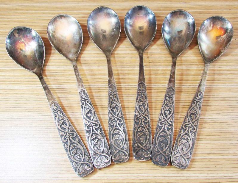 S.S.C.B DÖNEMİ RUSYASI 1970 LERDEN, ÜNLÜ İMALATÇI "RMZ REZHEVSKY" FİRMASININ SÜPER SANATLI, NİKEL-GÜMÜŞ ALAŞIMI AĞIR VE DOLGUN YAPILI 6 LI KAŞIK TAKIMI, SAĞLAM VE TEMİZ,SANIRIM PEK KULLANILMAMIŞ, SİLİNİP PARLATILIRSA SÜPER OLUR, UZUNLUKLARI 17cm, GÜZELLİĞİNİN DETAYLARI ÜRÜN RESİMLERİNDE,