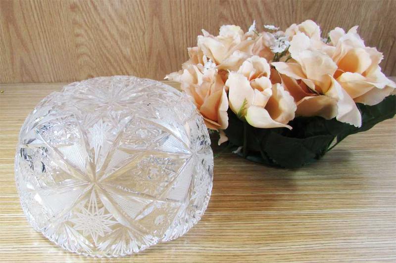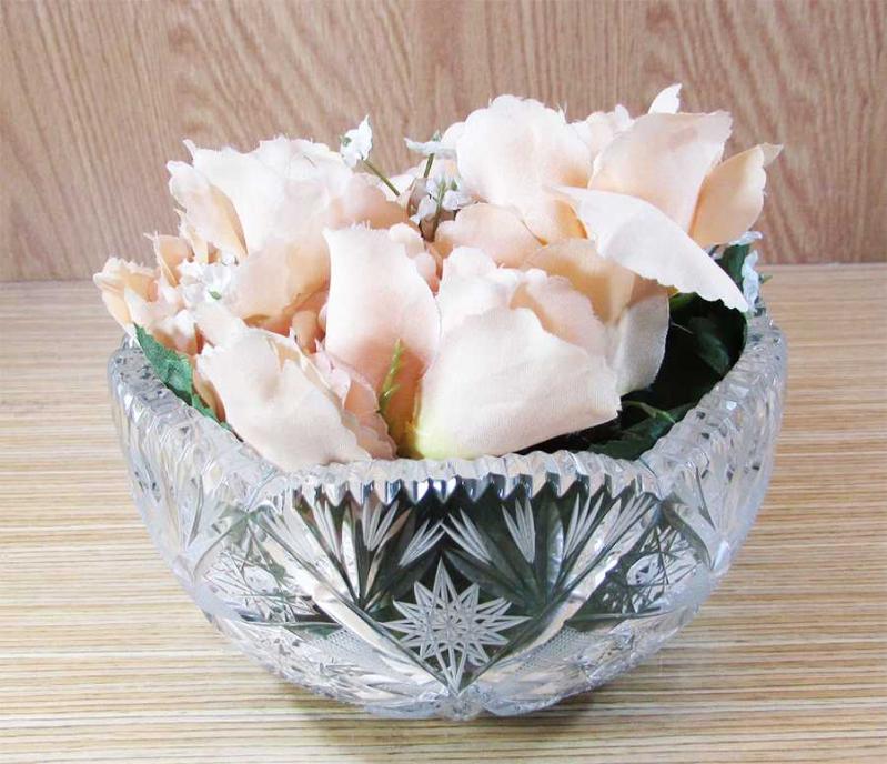 VİNTAGE, ÇOK GÜZEL VE DEĞİŞİK FORMDA, KALIN KESME KRİSTAL CAM JARDİNYER, İLE İÇİNDEKİ YAPAY ÇİÇEĞİ BİRLİKTE, SAĞLAM VE TEMİZ,HARİKA GÖRÜNÜMLÜ, KENAR YÜKSEKLİĞİ 9cm,AĞIZ ÇAP GENİŞLİĞİ 15cm