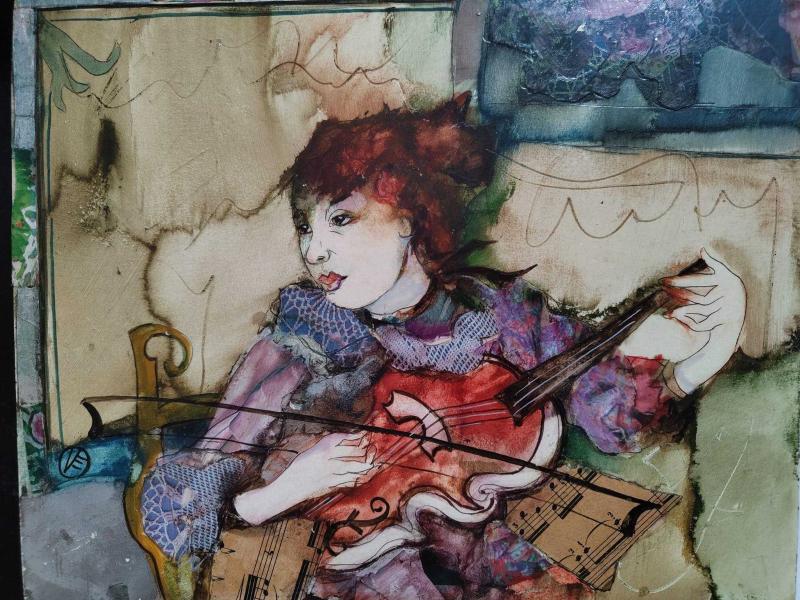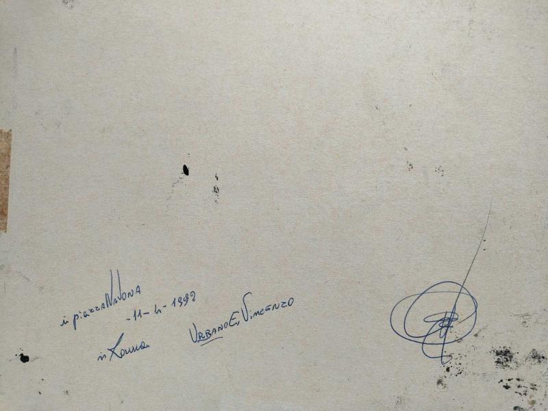 Vincenzo Urbano imzalı karışık teknik 1992 tarihli tablo. Karton üzerine yağlıboya ve kolaj birlikte uygulanmıştır. 24x30 cm ölçülerinde, çerçeveli ve camlıdır.
