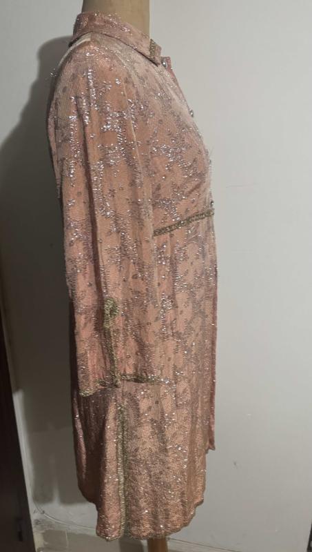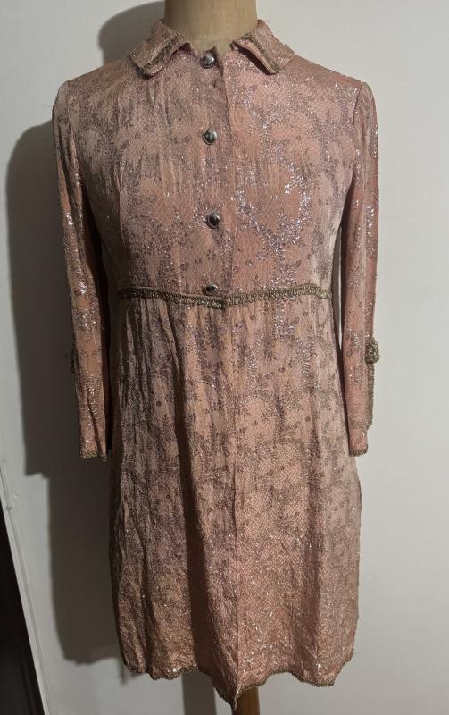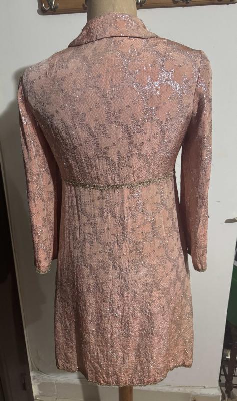 Vintage 1960'lar Brokar Ceket Elbise - Koleksiyonluk Parça 60’ların sonu, 70’lerin başına ait, gerçek bir dönem parçasıdır. Somon rengi üzerine altın sarısı simli brokar kumaşıyla son derece zarif ve ağır bir duruşu vardır. İmparator (Empire) bel kesimi ve A-form etek. Yaka, bel ve kollarda gold biyeler; dönemine uygun metalik düğmeler., bir ay önce kitantik’te satışa sunulmuştur.
