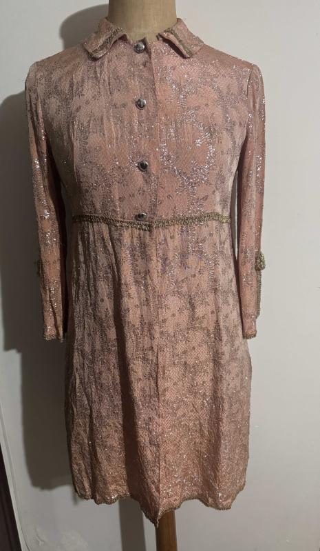 Vintage 1960'lar Brokar Ceket Elbise - Koleksiyonluk Parça 60’ların sonu, 70’lerin başına ait, gerçek bir dönem parçasıdır. Somon rengi üzerine altın sarısı simli brokar kumaşıyla son derece zarif ve ağır bir duruşu vardır. İmparator (Empire) bel kesimi ve A-form etek. Yaka, bel ve kollarda gold biyeler; dönemine uygun metalik düğmeler. başlıklı antika/koleksiyon objesi Osmanlı menşe’lidir. Objenin ait olduğu dönem bilinmeketedir.