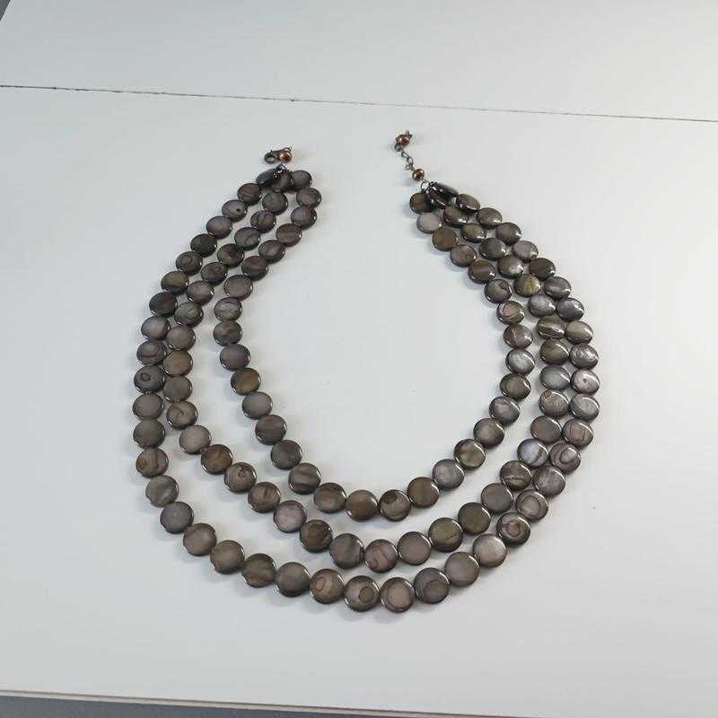 Vintage 3 Sıra Kahverengi Yuvarlak Sedef Taşlı Kolye başlıklı antika/koleksiyon objesinin menşei belirtilmemiştir. Objenin ait olduğu dönem bilinmeketedir.