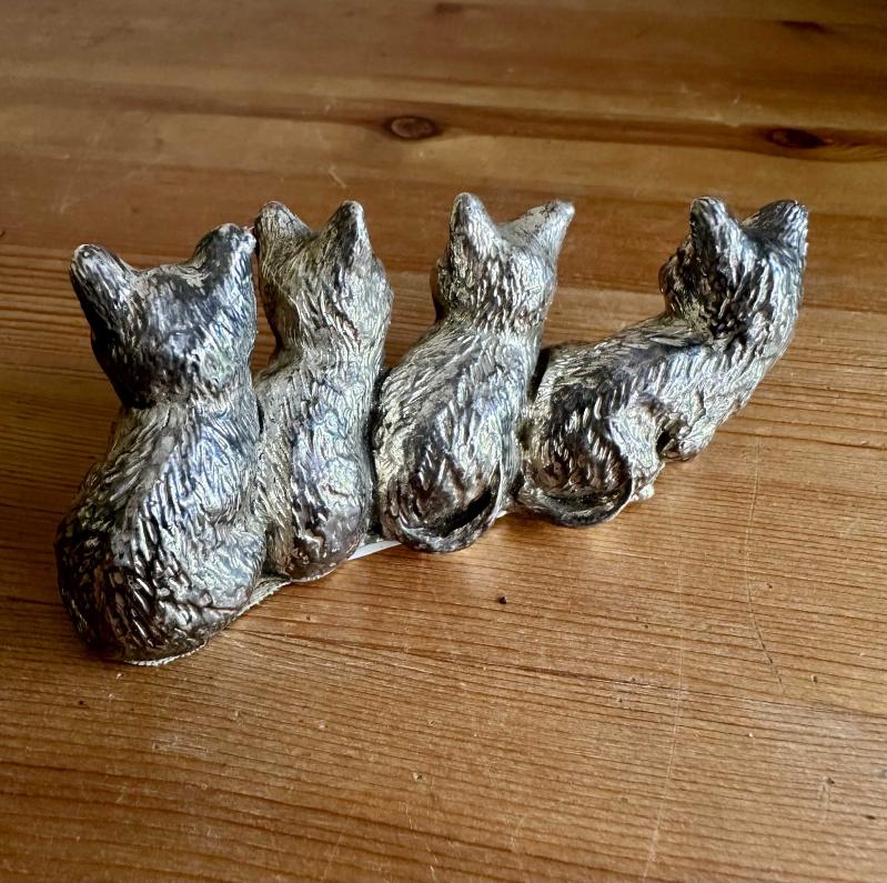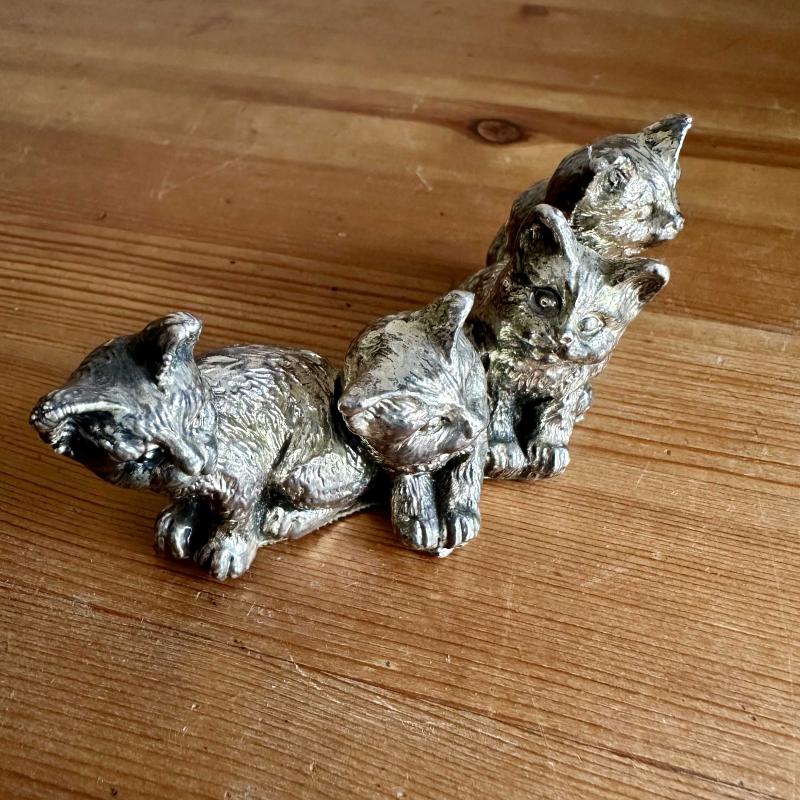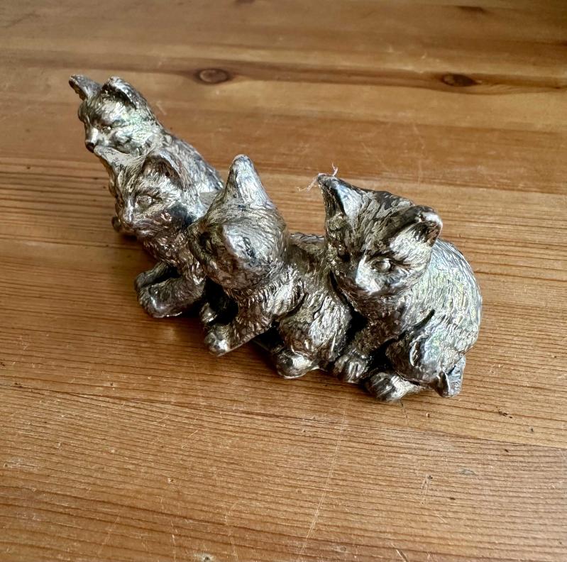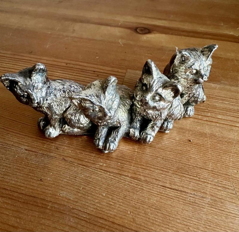 Vintage 80'ler dönemi Gümüş kaplama Dört adet sevimli kedi figüründen oluşan bu biblo seti,11x5 cm ölçüsünde, 165 gr ağırlıkta olup evinize zarif bir dokunuş katacaktır. Detaylı işçiliği ve parlak gümüş rengi ile dikkat çekiyor. #Vintagebiblo #kediBiblosu #gümüş #gümüşkaplama #hayvanbiblosu #kedifigürü #kedi #gümüşkedi #metalkedi #kediler #dekorasyon