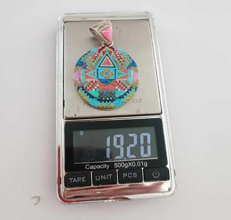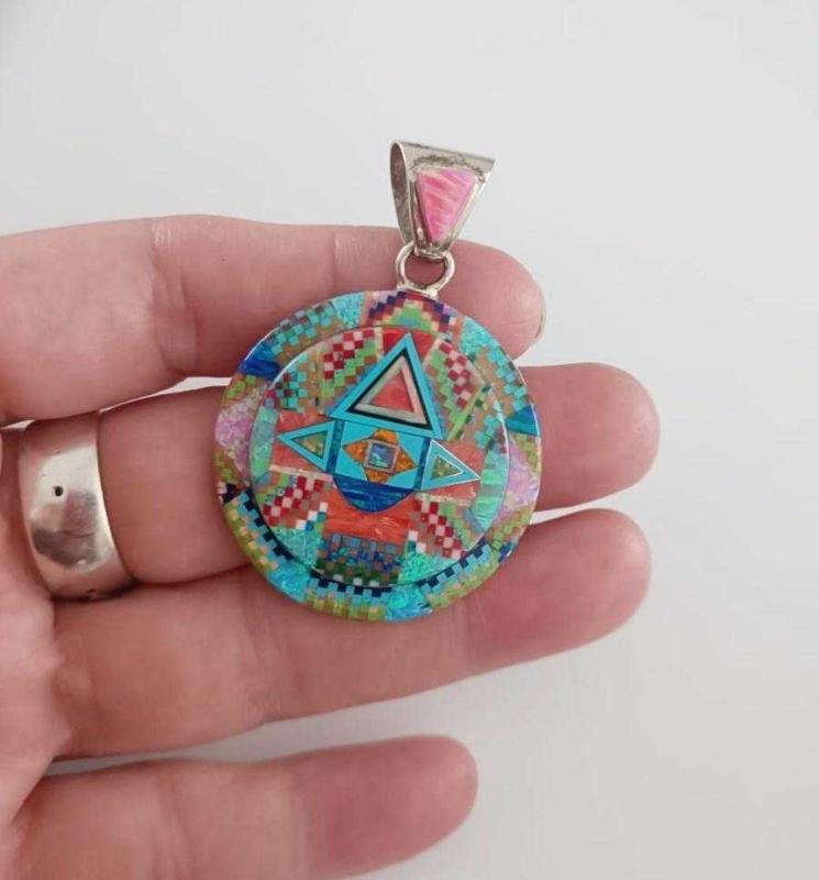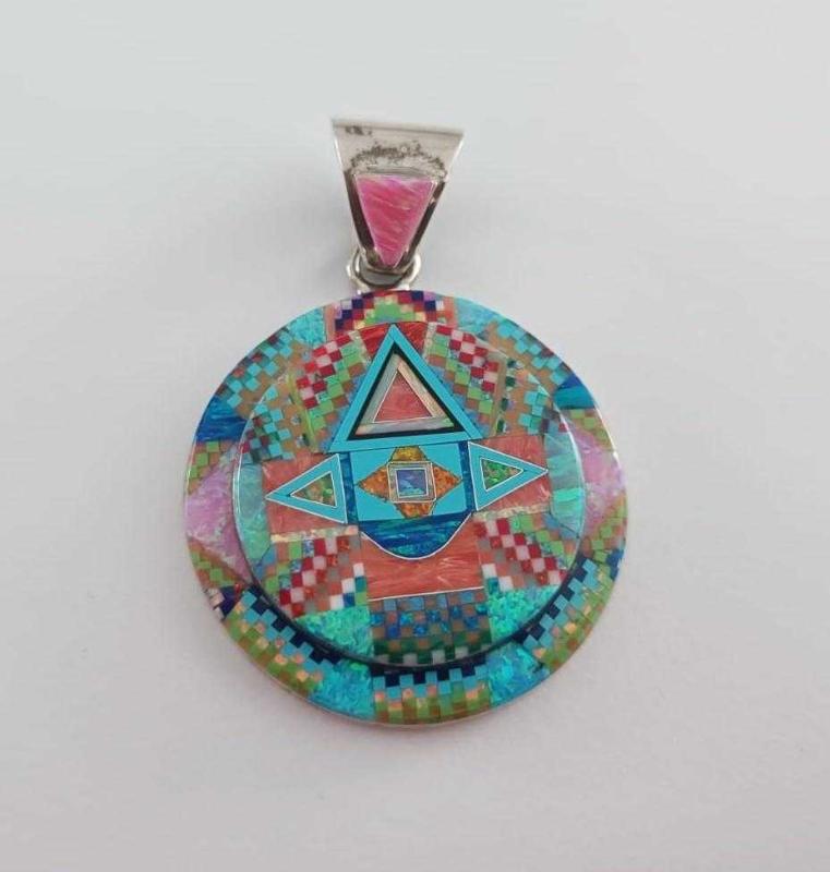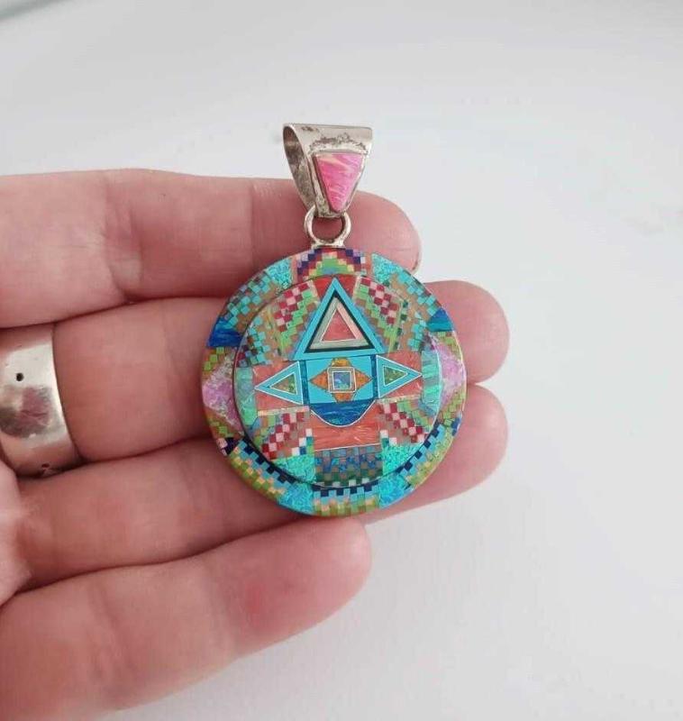 Vintage 925 Ayar Gümüş Tom Taylor Micro İnlay Taşlarla Bezeli Kolye Ucu Navajo Tılsım serisi başlıklı antika/koleksiyon objesinin menşei belirtilmemiştir. 2000 ve sonrası dönemine aittir.