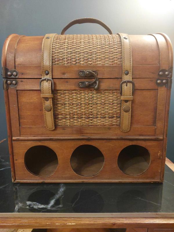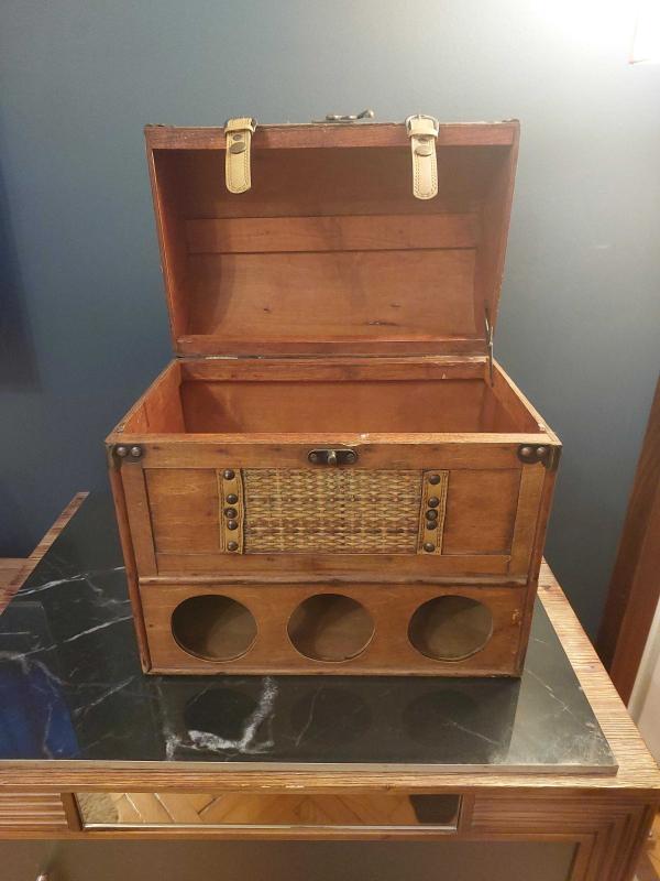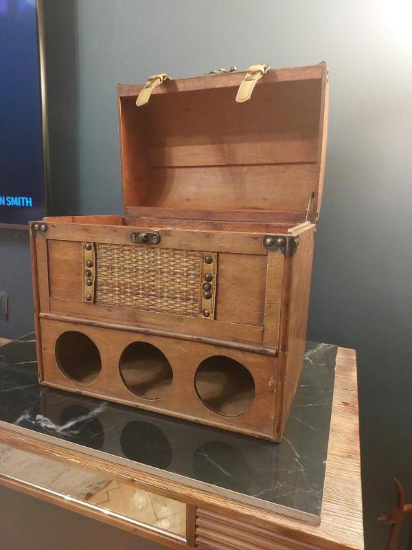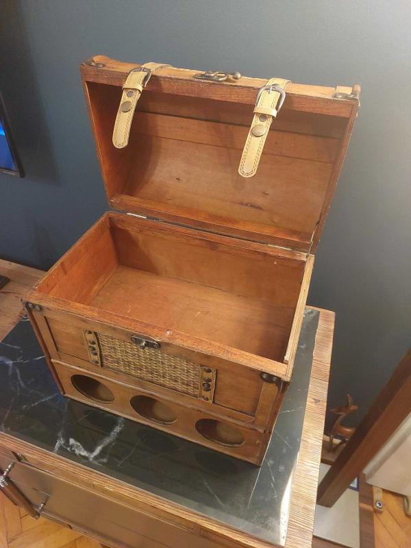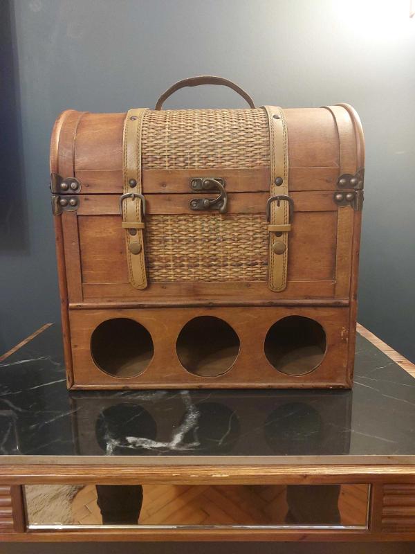 Vintage ahşap bir üründür.Nadir bir ürün ve tamamen el işçiliği ile yapılmıştır.Örme detaylı,ve kemerli deri kayışlı erkek bavulu olarakta tasarlanmıştır.Desensiz tasarımı ve yine deriden tutma sapıda bulunmaktadır.Orta bölümü metal yukarı aşağı açılan kendinden kilidi vardır.Deri kemerler ise kapalı vaziyetteyken çıt çıt düğmelere takılmaktadır.Altında bulunan 3 dairesel bölümü şaraplarınızı yatık bir şekilde koyabileceğiniz mini mahsen olarak tasarlanmıştır.İç kısmı gayet geniş ve özel ürünlerinizi içerisinde muhafaza edebilirsiniz.Ürünün boyu 35 Cm'dir.Eni 35 Cm'dir.Derinlik 24 Cm'dir.Kapak altındaki iç bölümünün eni 34 Cm ve İç derinliği 22 Cm'dir.Özenle Paketlenecektir.Çok Şık ve Dekoratif bir üründür.Diğer ilânlarımı incelemeyi unutmayınız.