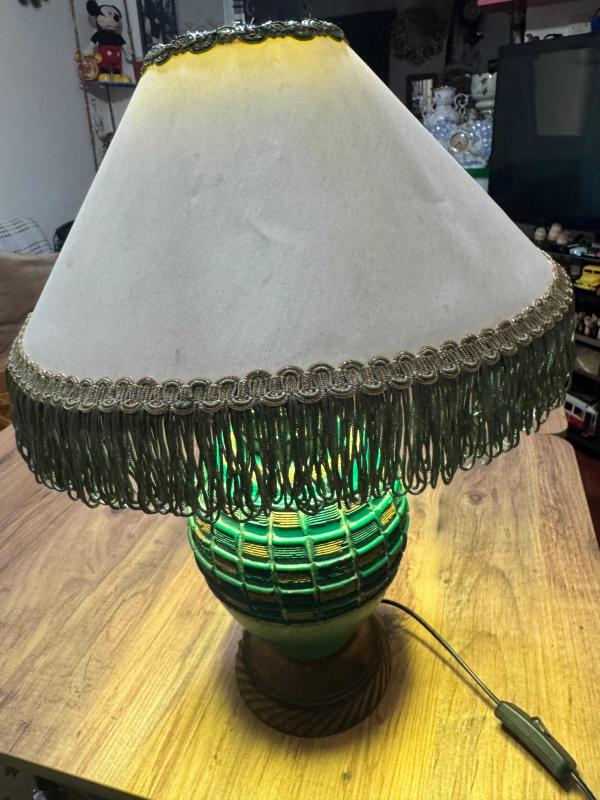 Vintage Ahşap Yeşil El işçiliği Abajur Masa Lambası Retro Şık 70'ler retro/vintage tasarım. Dönem ruhunu yansıtan, saçağı püsküllü orijinal krem rengi şapka. Çalışır vaziyette, temiz ve bakımlı. Kablosu ve anahtarı sağlamdır. Boy Şapkasız 42 cm Şapkalı 50 cm Şapka çapı 35 cm