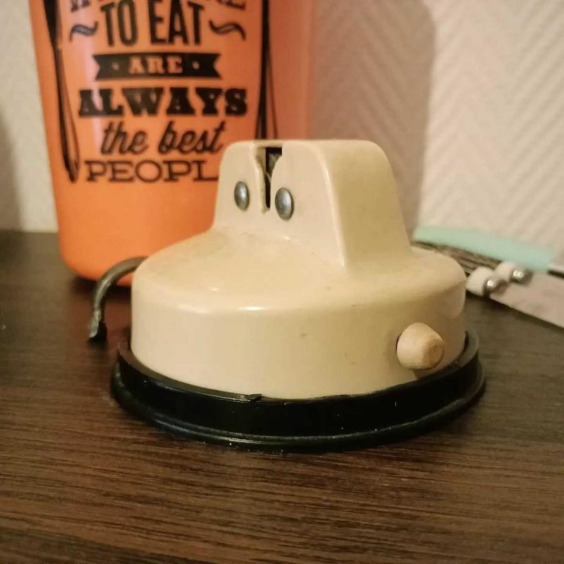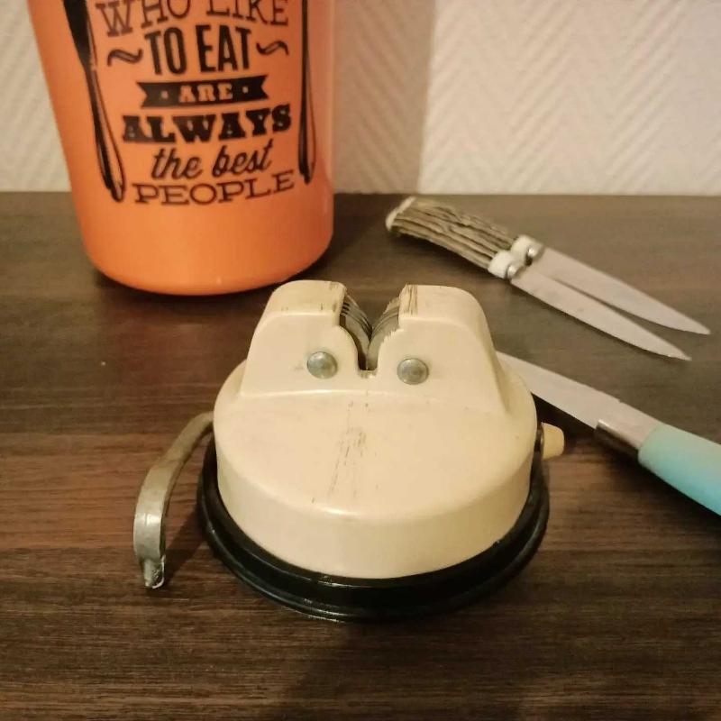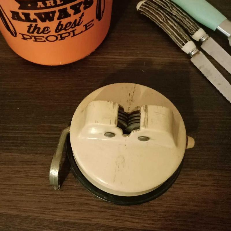 Bunu hatırlayanlar burada mı? Yüzyıl ortasından, harika vintage görünümü ve krem rengi ile (artık çok verimli çalışamadığı için) dekorluk biley. Yaptığı ağır iş sebebiyle bıçakların gazabına uğramış ve bu izleri üzerinde taşıyan, zamanında pek çok sofranın hazırlanması ve yemeğin yapılmasında emeği geçen bıçak bileme aletimiz sizlerle. Gerçek ve orijinal vintageseverler için... Mutfak ya da işletmelerde dekor olarak harika duracağından eminiz.