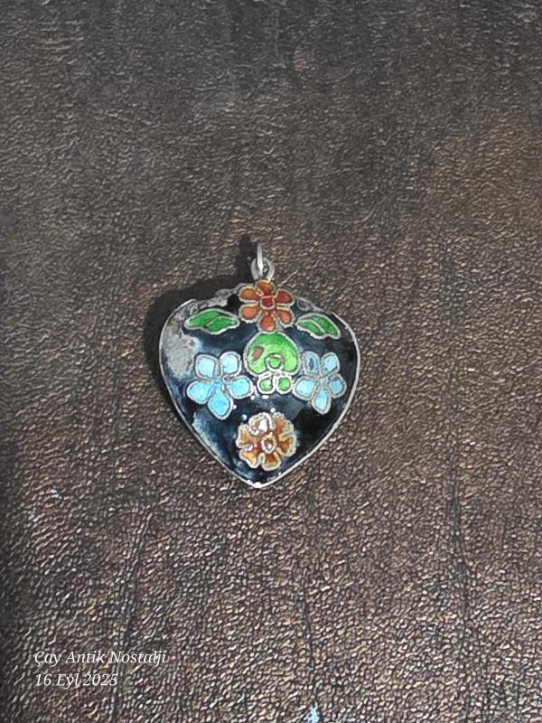 Vintage Cloissonne Kabartmalı Kalp Kolye Siyah, çok renkli çiçeklerle, 2 ay önce kitantik’te satışa sunulmuştur.