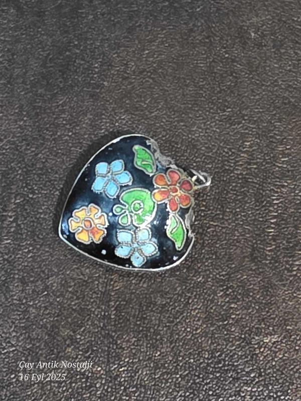 Vintage Cloissonne Kabartmalı Kalp Kolye Siyah, çok renkli çiçeklerle başlıklı antika/koleksiyon objesi Türkiye menşe’lidir. 1980-1999 arası dönemine aittir.