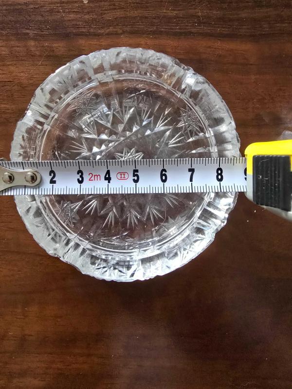 Tip: Yuvarlak, ağır, kesme cam/kristal küllük. Desen: Küllüklerin hem tabanında hem de kenarlarında belirgin yıldız/ışın (starburst) ve geometrik kesim desenleri (diamond cut, fan cut gibi) bulunmaktadır. Bu desenler ışığı yansıtarak kristal bir görünüm sağlar. Boyut: Birinci fotoğraftaki gibi, çapı yaklaşık olarak 8 cm civarındadır. Bu, küçük/orta boy bir küllük boyutudur ve çift olarak bulunmaları nadir bir özelliktir. Dönem: Bu tip ağır, kesme cam eşyalar genellikle 1950'ler ile 1980'ler arasındaki dönemde popülerdi ve Çekoslovakya (Bohemya), Almanya gibi ülkelerde üretilmiş olabilir. Durum: Ürünün genel durumu fotoğraflardaki gibi iyidir, çatlak veya kırık yoktur.
