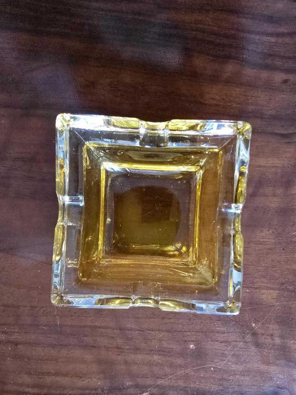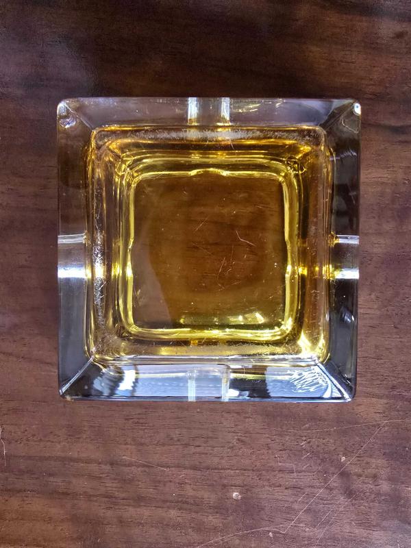 Vintage Mid-Century Modern (Orta Yüzyıl Modern) tarzı, sarı/kehribar (amber) renkli, kare şeklinde ve dört sigara/puro dayama yuvalı kalın cam bir küllük, 2 gün önce kitantik’te satışa sunulmuştur.
