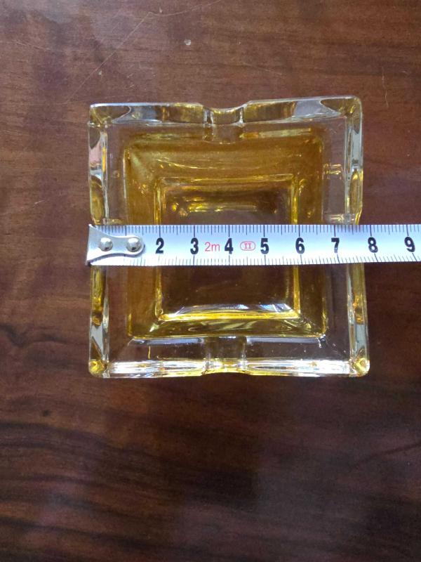 Vintage Mid-Century Modern (Orta Yüzyıl Modern) tarzı, sarı/kehribar (amber) renkli, kare şeklinde ve dört sigara/puro dayama yuvalı kalın cam bir küllük başlıklı antika/koleksiyon objesi Türkiye menşe’lidir. 1940-1959 arası dönemine aittir.