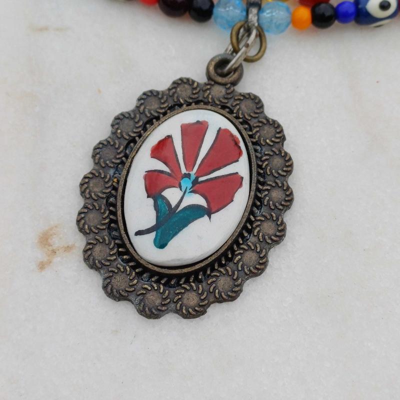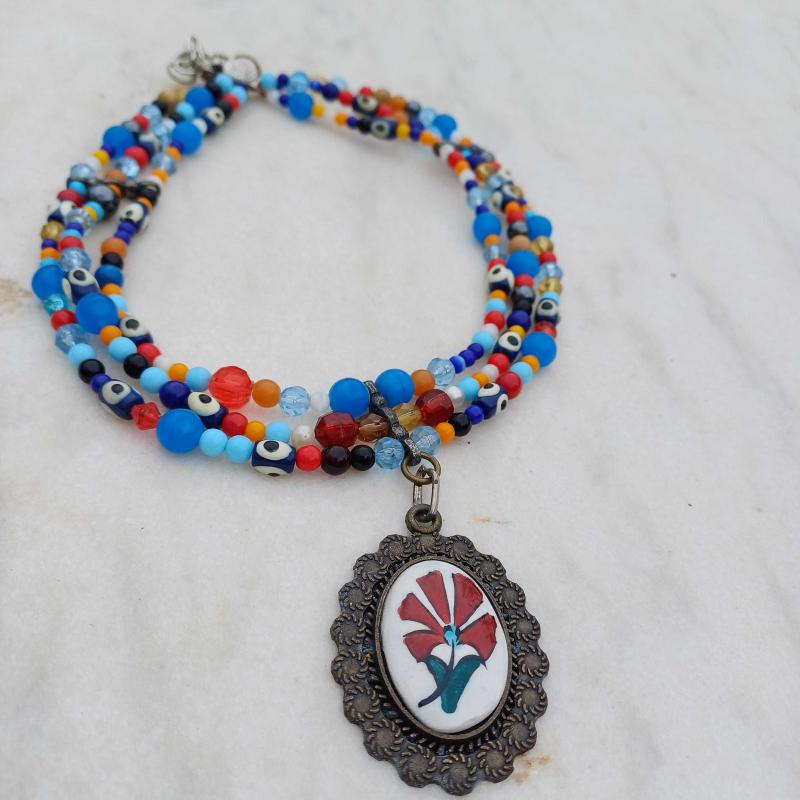 3 sıra gerdanlık kolye vintage. Ucunda porselen bir kolye ucu mevcut. Eski cam ve plastik boncuklardan yapılmiş. Ic sıra Uzunluk 36 cm Dış sıra uzunluk 45 cm Uzatma zinciri mevcuttur.5 cm daha uzaun kullanilabilir. Kolye genişlik 2,5 cm Kullanima dair izler olabilir.