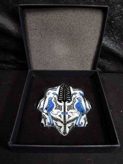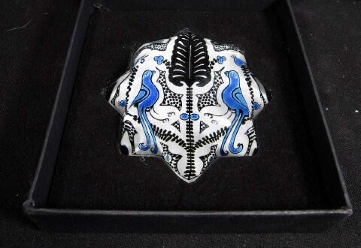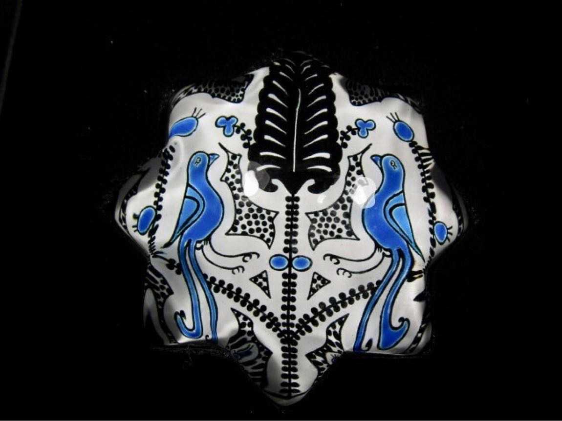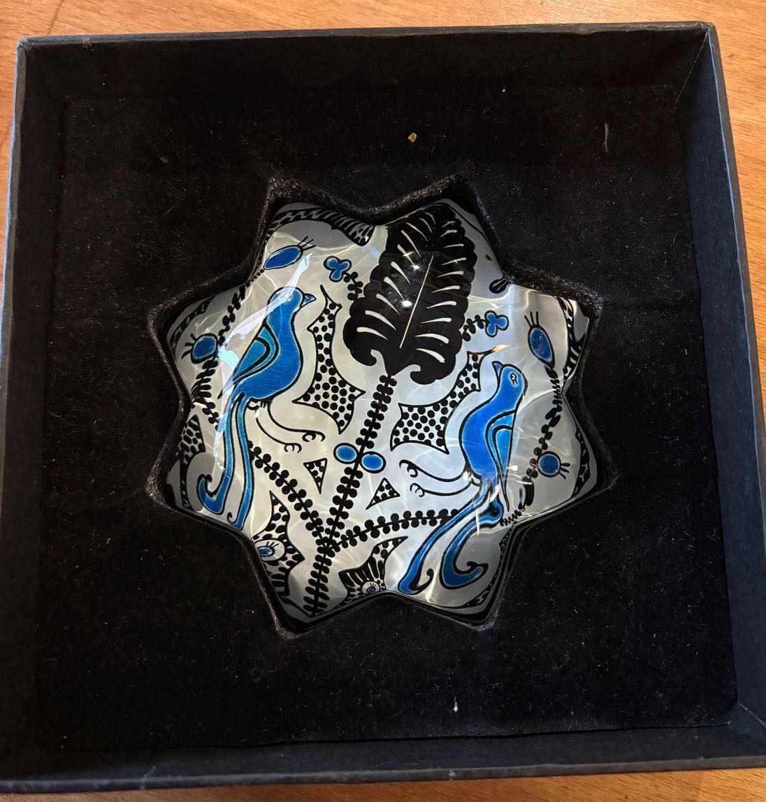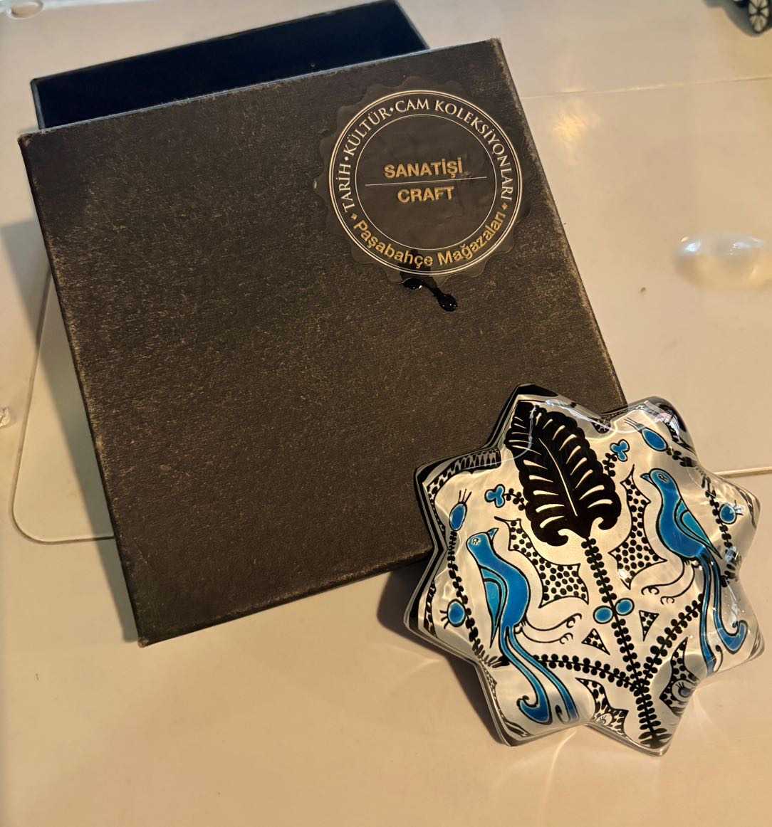 Eski döneme ait Vintage Paşabahçe cam sanatı Koleksiyonluk Paşabahçe Yıldız Şeklinde, Her İki Yanında Kuş Figürü Bulunan Tüylü Kağıt Ağırlığı - Kutusuyla Birlikte