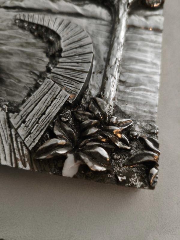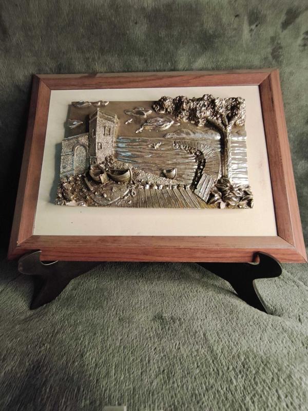 Alçı zemin üzerine gümüş kaplama ile yapılmış, ahşap çerçeveli dekoratif tablo. 1970–80’ler dönemine ait özgün bir ev dekor ürünü. Alt kısmında çok küçük bir defosu bulunuyor ancak genel durumu gayet iyi. Koleksiyonluk ya da dekoratif amaçlı değerlendirmek için ideal. sadece minicik kusuru vardır fotograflarda gösterilmiştir...