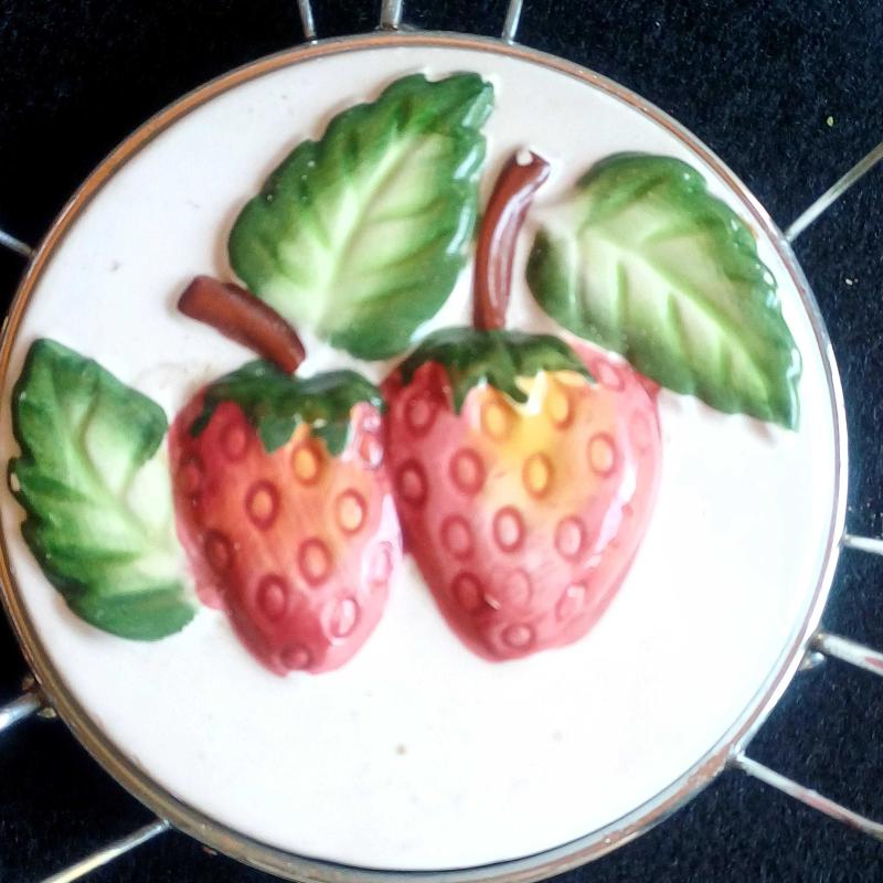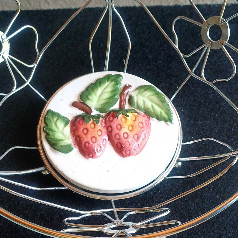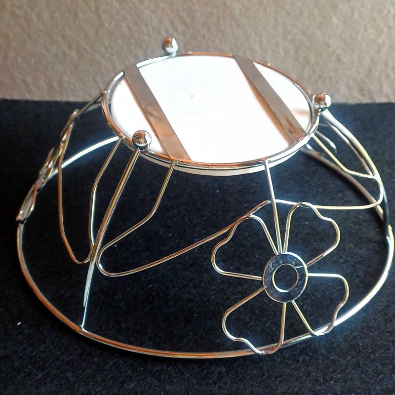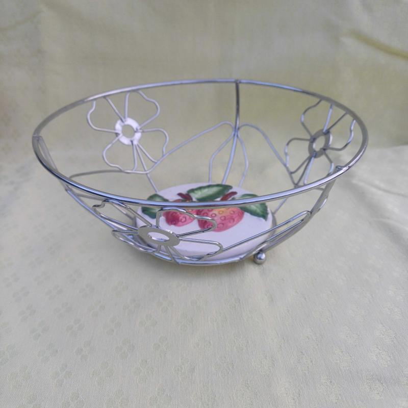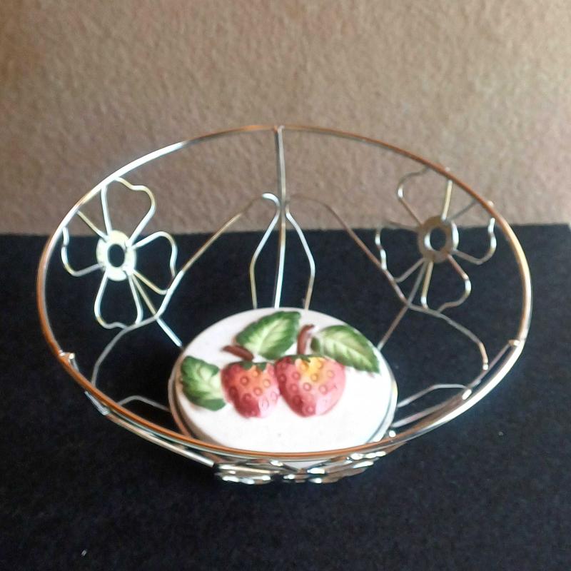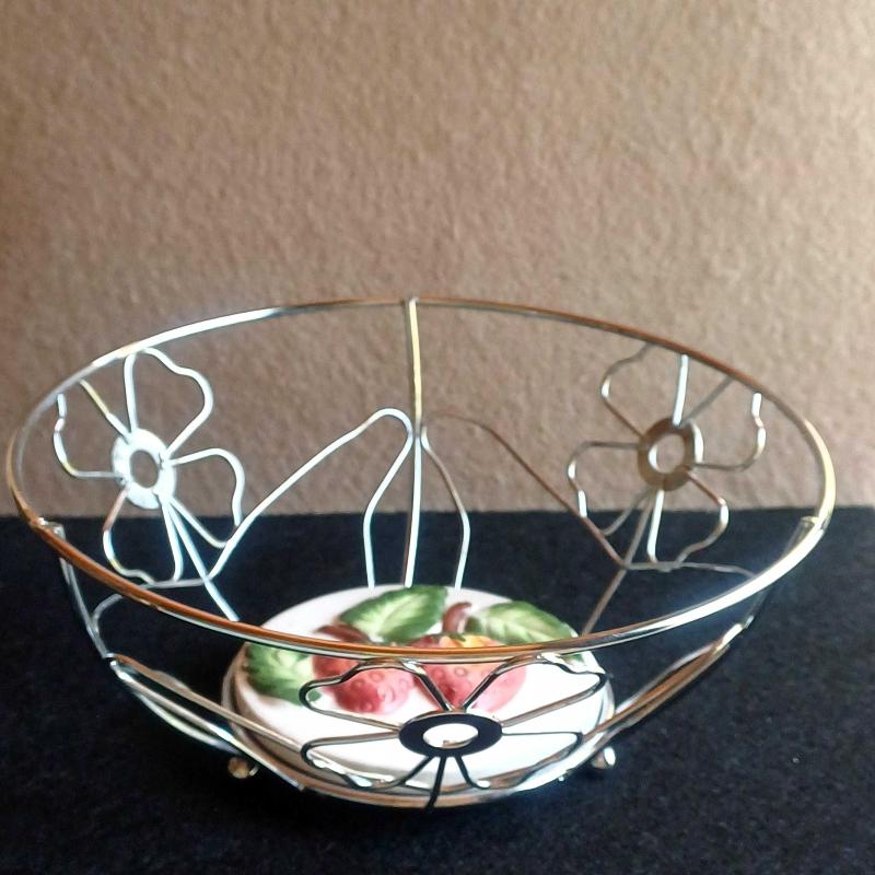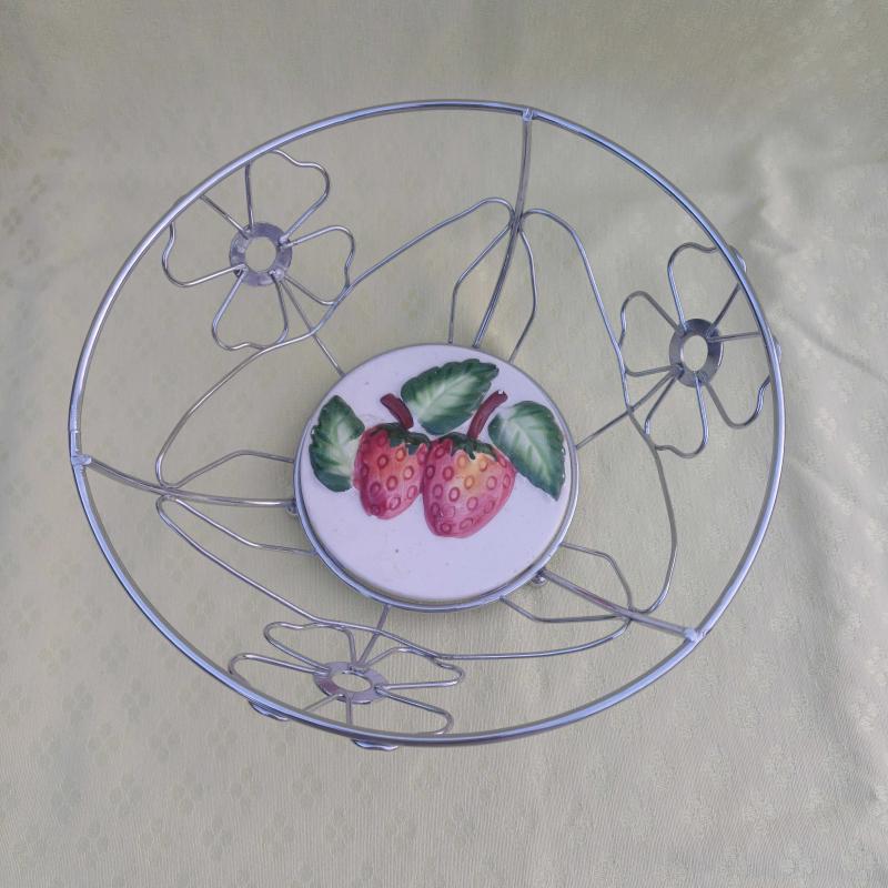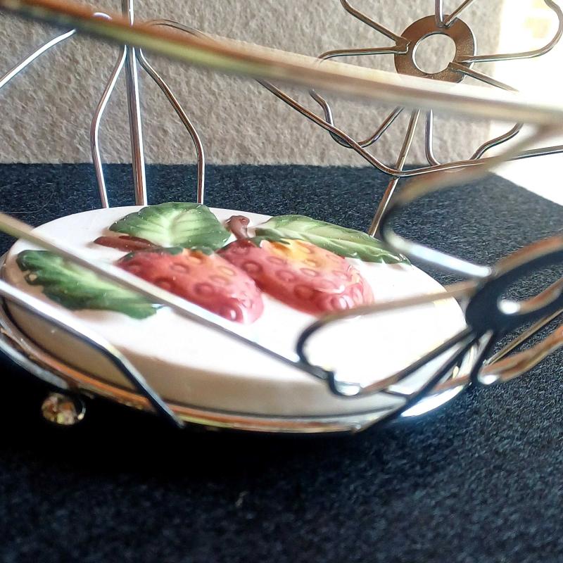 Eskilerden. Avrupa. Donemini bilmiyorum. Seramik,çilek desenli üc boyutlu taban. Cicek desenli gumus rengi metal kenarlar. Ayakli. Şık sofralar için güzel bir sepet. Alt cap 10 cm Ust cap 18 cm Yukseklik 8 cm