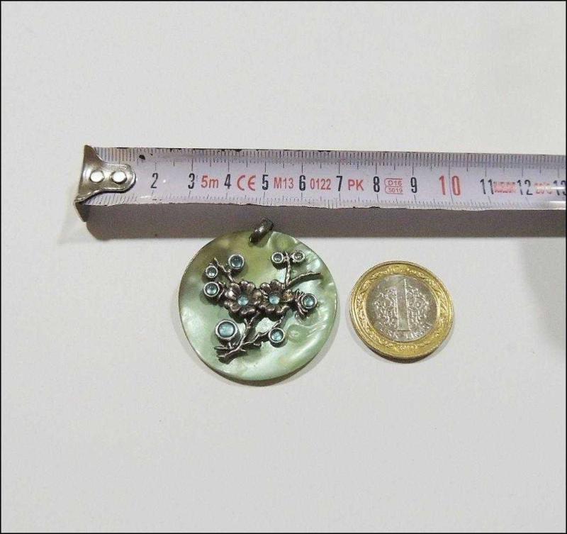 Vintage Yeşil Sedef Üzerine Gümüş Ton Metal Çiçek Kolye ucu (0060) başlıklı antika/koleksiyon objesinin menşei belirtilmemiştir. Objenin ait olduğu dönem bilinmeketedir.