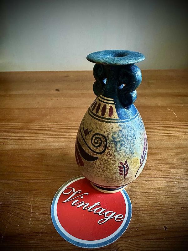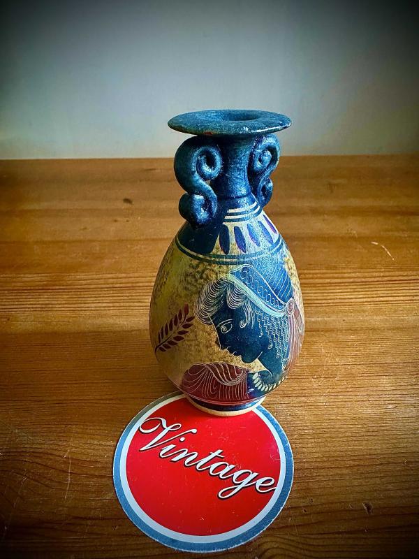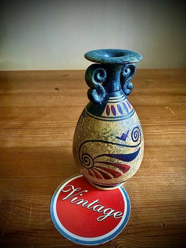 Vintage Yunan el işçiliği,antik amfora tarzında küçük seramik vazo başlıklı antika/koleksiyon objesi Avrupa menşe’lidir. 1960-1979 arası dönemine aittir.