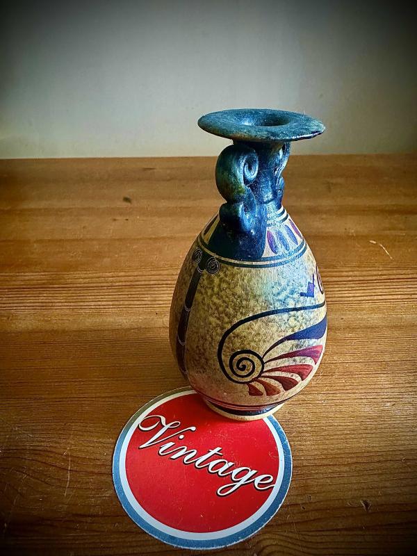 iadesiz satış... Vintage Yunan el işçiliği,amfora tarzında küçük seramik vazo... Üzerindeki spiral ve akışkan motifler, Antik Yunan sanatı etkisini tanımlar ve Ege kültürüne özgü estetik anlayışı yansıtır. Çok zarif ve dekoratif bir seramik vazo . Üst kısmı koyu mavi renkte ve parlak sırlı; ağız kısmı genişçe açılıyor. Boyun bölümünde iki yanda kıvrımlı, kabartma şeklinde süslemeler var. Alt gövdesi ise daha açık, taş dokulu bir zemine sahip ve üzerinde spiral, dalga ve bitkiyi andıran motifler bulunuyor. Bu desenler mavi, kırmızı ve mor tonlarıyla yapılmış. 10cm boyunda 6cm enindedir... #vintage #yunanvazo #dekoratifobje #amfora #antikyunan #yunanseramikvazo