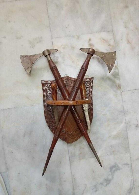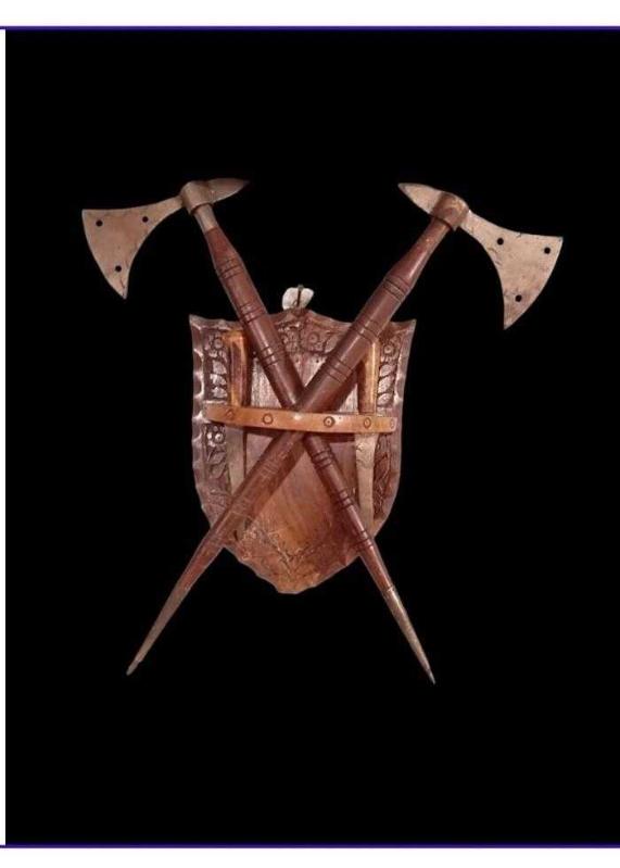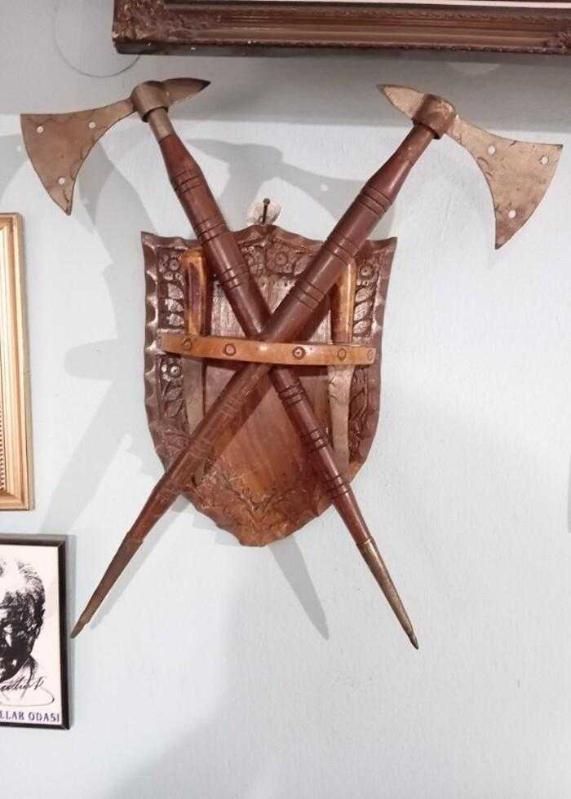 Vintage ahşap el işleme ile yapılmış baltalar ve bıçaklar duvar başlıklı antika/koleksiyon objesi Avrupa menşe’lidir. Objenin ait olduğu dönem bilinmeketedir.