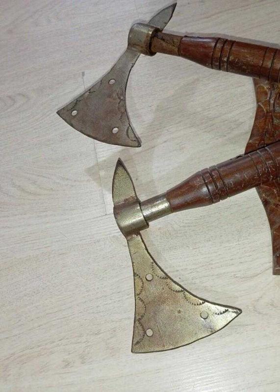 Vintage ahşap el oyma ve el işçiliği ile yapılmış baltalar ve bıçaklar duvar süsü baltalar ve bıçaklar metal ağızlı. Balta uçları metal