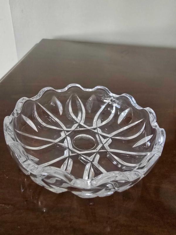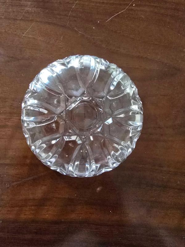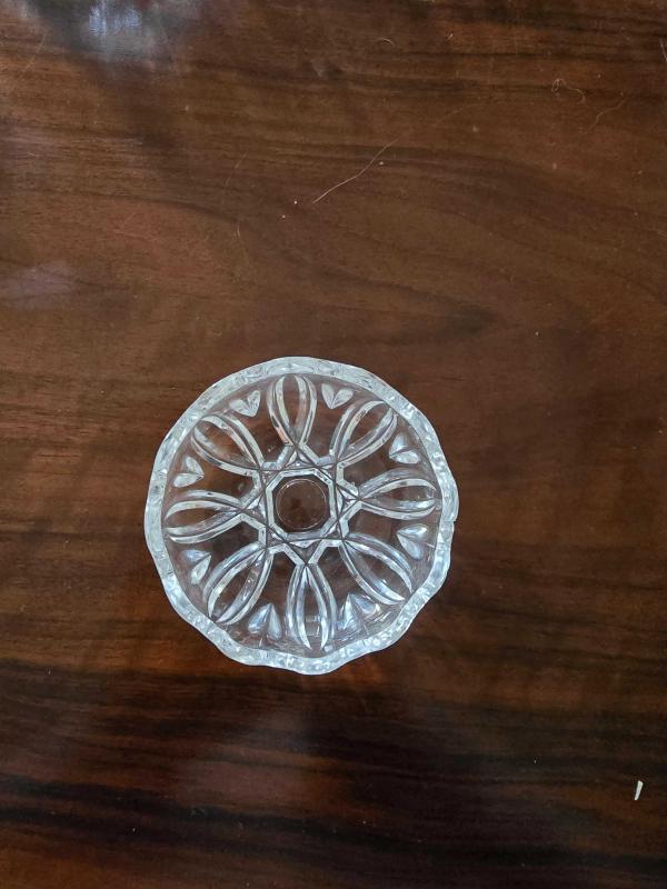 Vintage kesme (kristal görünümlü) camdan yapılmış, kenarları dalgalı, yıldız ve yaprak benzeri geometrik desenlere sahip küçük kase (çerezlik/mezelik) başlıklı antika/koleksiyon objesi Amerika menşe’lidir. 1940-1959 arası dönemine aittir.