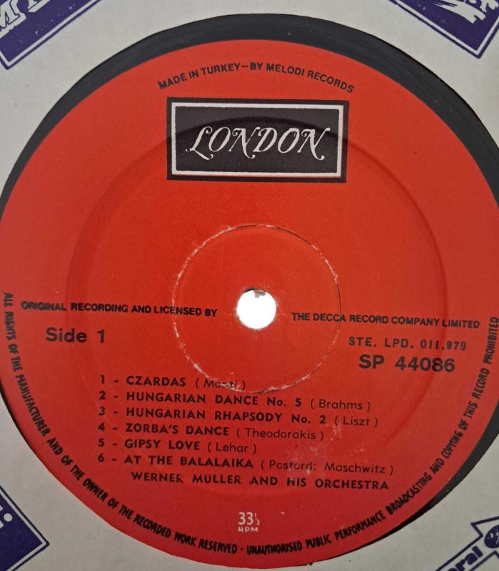 Fotoğraftaki gibi temiz, çok titiz kullanılmış, ilk sahibinden, kütüphane plağı. KAPAKSIZ Werner Müller And His Orchestra* – Gypsy! Label:London Series: 4 Stereo Format:Vinyl, LP, Album, Stereo Country:Europe Released:1966 Genre:Folk, World, & Country Style:Romantic, Folk A1 Czardas Composed By – Monti* 4:25 A2 Hungarian Dance No. 5 Arranged By [Arr.] – Förster* Composed By – Brahms* 2:54 A3 Hungarian Rhapsody No. 2 Arranged By [Arr.] – Müller* Composed By – Liszt* 4:18 A4 Zorba's Dance Composed By – Theodorakis* 2:48 A5 Gypsy Love Composed By – Léhar* 4:17 A6 At The Balalaika Composed By – Maschwitz*, Posford* 2:28 B1 Two Guitars Arranged By [Arr.] – Müller* Composed By – Trad.* 3:10 B2 Hora Staccato Composed By – Dinicu*, Heifetz* 2:05 B3 Mischa Composed By – Roda*, Roubaud* 2:28 B4 Komm Zigany Composed By – Kálmán* 2:57 B5 Black Eyes Arranged By [Arr.] – Förster* Composed By – Trad.* 3:22 B6 Golden Earrings Composed By – Livingston*, Evans*, Young*