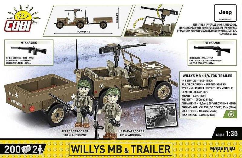 Willys MB & Trailer seti yaklaşık 1/35 ölçeğindedir. sette bir adet jip ve bir adet römork mevcuttur. Kauçuk lastikli tekerlekler dönebilir ve hem jipe hem de römorka konulabilen bir ağır makineli tüfek ve diğer bazı silahlar sete dahildir. Set, Amerikan 101. Hava İndirme Tümeni "Screaming Eagles" askerlerini temsil eden iki figür içerir. Araç ve figürler, tarihi işaretlere dayanan yüksek kaliteli baskılara sahiptir. Askerlerin omuzlarındaki karakteristik kartallı yamalar gibi küçük ayrıntılar sette görülebilir. Ürün, Avrupa Birliği (AB) oyuncak güvenliği standardı olan EN 71 ve ASTM standartlarına uygun olarak Polonya'da üretilmiştir. Yapı oyuncağıdır. GÜVENLİK UYARISI 3 Yaş (36 aydan) küçük olan çocuklar için uygun değildir. Yutulması halinde boğulma tehlikesine neden olabilecek küçük parçalar içerir. Referans için ambalajı saklamanızı öneririz. Renkler ve stiller değişiklik gösterebilir. - Bitmiş Ürün Ölçüleri: * Uzunluk:17,5cm * Genişlik:5,0cm * Yükseklik:7,0cm - Kutu Numarası: COBI-3132 - Parça Sayısı: 200 - Figür Sayısı: 2