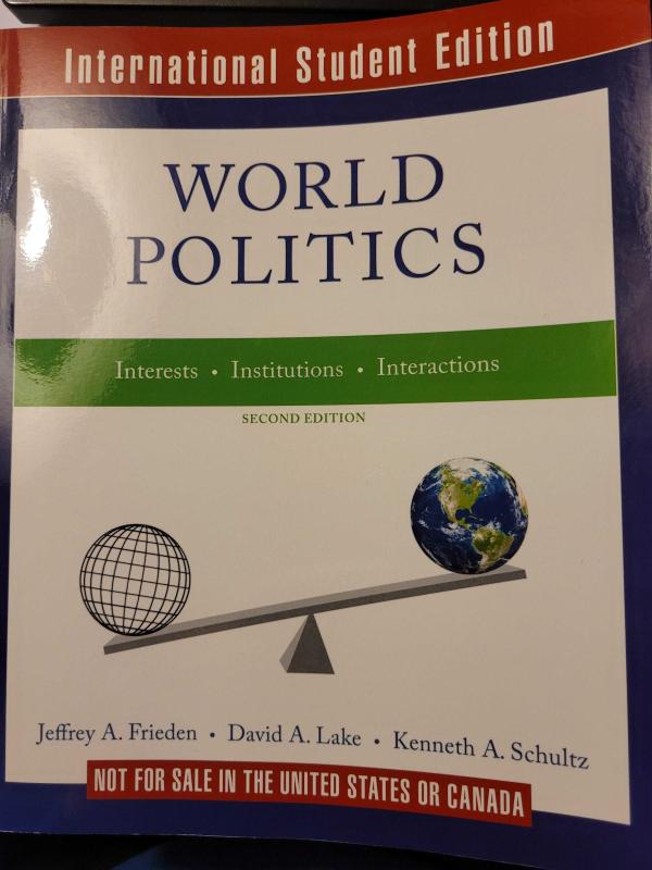 World Politics, Jeffrey A. Frieden, David A. Lake, Kenneth A. Schultz tarafından kaleme alınmıştır. Kitap 2013 yılında Norton tarafından yayınlanmıştır. 579 sayfadır. World Politics adlı eser İngilizce dilindedir.