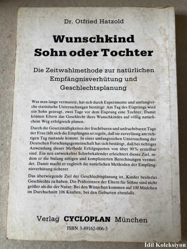 Wunschkind Sohn oder Tochter : Die Zeitwahlmethode zur natürlichen Empfangnisverhütung und Geschlechtsplanung - Prof. Dr. Hans Harmsen - Dr. Otfried Hatzold - Almanca Kitap (İstenilen Çocuk Oğul veya Kız: Doğal Doğum Kontrolü ve Cinsiyet Planlaması için Zamanlama Yöntemi), Dr. Otfried Hatzold tarafından kaleme alınmıştır. Eser - editörlüğünde hazırlanmıştır. Kitap 1991 yılında Verlag Cycloplan tarafından [München] - ISBN kodu ile yayınlanmıştır. Bu baskının çevirisi - tarafından yapılmıştır. 187 sayfadır. Sayfa bilgisi - olarak belirtilmiştir. Wunschkind Sohn oder Tochter : Die Zeitwahlmethode zur natürlichen Empfangnisverhütung und Geschlechtsplanung - Prof. Dr. Hans Harmsen - Dr. Otfried Hatzold - Almanca Kitap (İstenilen Çocuk Oğul veya Kız: Doğal Doğum Kontrolü ve Cinsiyet Planlaması için Zamanlama Yöntemi) adlı eser Almanca dilindedir.