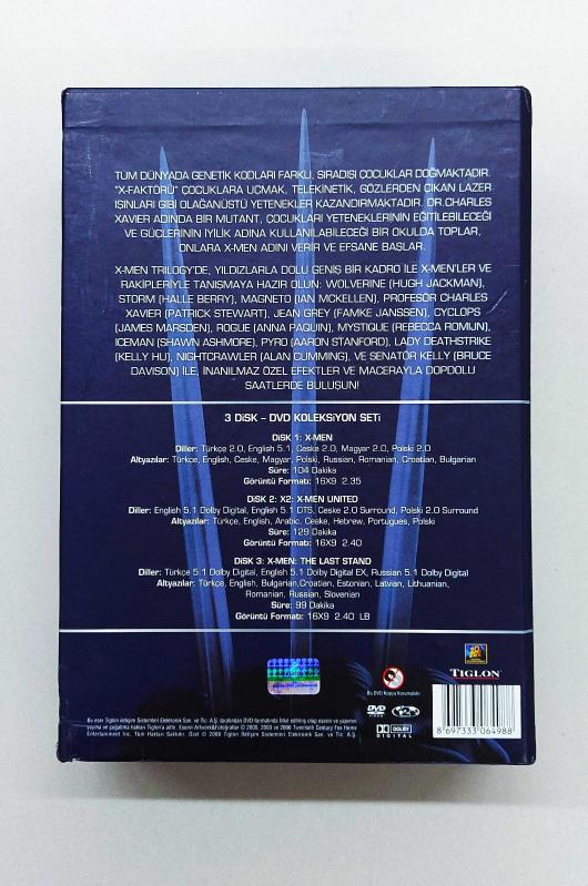 2006 yılında koleksiyonerler için özel box set olarak basılan X-Men film üçlemesi. Yaklaşık 20 yıl önce piyasaya sürülen bir set olmasına rağmen durumu kusursuza yakındır. Dış kutuda herhangi bir yıpranma söz konusu değildir. Kutu içerisinde tüm filmlerin ayrı ayrı kendi özel kutuları mevcuttur. Disklerde çizik bulunmamaktadır, sıfır ayarındadırlar. Her biri tek tek test edilmiştir, sorunsuz çalışmaktadırlar. Tüm filmlerde Türkçe seçenek mevcuttur. Detaylar için fotoğraflardan dış kutunun arka kısmını inceleyebilirsiniz. Lütfen dış kutusu kartondan yapılmış standart film box setleri ile karıştırmayınız. Dış kutu son derece kaliteli bir malzemeden üretilmiş olup içinde bulunan filmlerle beraber ağırlığı göz dolduran bir üründür. Gerek kondisyonu gerek içeriği sebebi ile ; kutulu DVD film koleksiyonerleri ve X-Men hayranları için son derece nadir bir üründür.