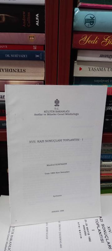 XVII. Kazı Sonuçları Toplantısı 1 25- 29 Mayıs 1994 Ayrı Basım 1994 Yılı Troia Çalışmaları, Manfred Korfman tarafından kaleme alınmıştır. Kitap 1996 yılında KÜLTÜR VE TURİZM BAKANLIĞI YAY. tarafından [Ankara] yayınlanmıştır. 536 sayfadır. XVII. Kazı Sonuçları Toplantısı 1 25- 29 Mayıs 1994 Ayrı Basım 1994 Yılı Troia Çalışmaları adlı eser Türkçe dilindedir.