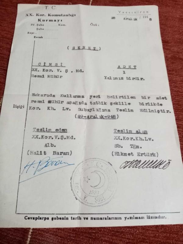 XX.KOL.Ordu Komutanlığı Kurmayı Senedi -1948 başlıklı ürün, Efemera, Müzik, Sinema > Belge ve Evraklar > Türkçe Belgeler kategorisi altında İkinci El olarak satılmaktadır.
