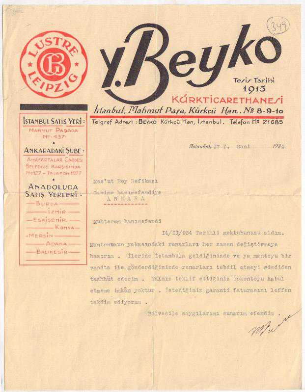 İstanbul, Ankara ve Anadolu'da pek çok ilde şubesi bulunan Y. Beyko Kürk Ticarethanesi'nden bir müşterisine gönderilen yazı.