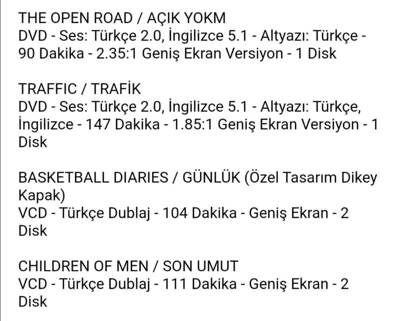 AVIATOR / GÖKLERİN HÂKİMİ DVD - Ses: Türkçe 5.1, İngilizce 5.1 - Altyazı: Türkçe, İngilizce - 163 Dakika - 2.35:1 Geniş Versiyon - 1 Disk BLOW / BEYAZ ŞEYTAN DVD - Ses: Türkçe 5.1, İngilizce 5.1 - Altyazı: Türkçe - 124 Dakika - 2.35:1 Geniş Versiyon - 1 Disk INTERVIEW / GÖRÜŞME DVD - Ses: Türkçe 5.1, Türkçe 2.0, İngilizce 5.1 - Altyazı: Türkçe - 81 Dakika - 1.85:1 Geniş Versiyon - 1 Disk MULHOLLAND DRIVE / MULHOLLAND ÇIKMAZI DVD - Ses: Türkçe 2.0, İngilizce 5.1 - Altyazı: Türkçe, İngilizce - 140 Dakika - 1.85:1 Geniş Ekran Versiyon - 1 Disk THE IMAGINARIUM OF DOCTOR PARNASSUS / DOKTOR PARNASSUS DVD - Ses: Türkçe 2.0, İngilizce 5.1, İngilizce 2.0 - Altyazı: Türkçe - 123 Dakika - 16X90 Versiyon - 1 Disk THE OPEN ROAD / AÇIK YOKM DVD - Ses: Türkçe 2.0, İngilizce 5.1 - Altyazı: Türkçe - 90 Dakika - 2.35:1 Geniş Ekran Versiyon - 1 Disk TRAFFIC / TRAFİK DVD - Ses: Türkçe 2.0, İngilizce 5.1 - Altyazı: Türkçe, İngilizce - 147 Dakika - 1.85:1 Geniş Ekran Versiyon - 1 Disk BASKETBALL DIARIES / GÜNLÜK (Özel Tasarım Dikey Kapak) VCD - Türkçe Dublaj - 104 Dakika - Geniş Ekran - 2 Disk CHILDREN OF MEN / SON UMUT VCD - Türkçe Dublaj - 111 Dakika - Geniş Ekran - 2 Disk FLASHBACKS OF A FOOL / BİR APTALIN ANILARI VCD - Türkçe Dublaj - 114 Dakika - Tam Ekran - 2 Disk MAN OF THE YEAR / YILIN BAŞKANI VCD - Türkçe Dublaj - 110 Dakika - Tam Ekran - 2 Disk ONE EIGHT SEVEN / 187 (Özel Tasarım Dikey Kapak) VCD - Türkçe Dublaj - 120 Dakika - Geniş Ekran - 2 Disk SLEEPERS / KARDEŞ GİBİYDİLER (Özel Tasarım Kapak) VCD - Türkçe Dublaj - 147 Dakika - Tam Ekran - 2 Disk SPEAK / KONUŞ BENiMLE VCD - Türkçe Dublaj - 88 Dakika - Tam Ekran - 2 Disk KARGOLAMA DUYURUSU : Kitantik.com ile anlaşmalı ve ALICI ÖDEMELİ kargo fiyatı PTT Kargo için 110.00 ₺ ‘dır.