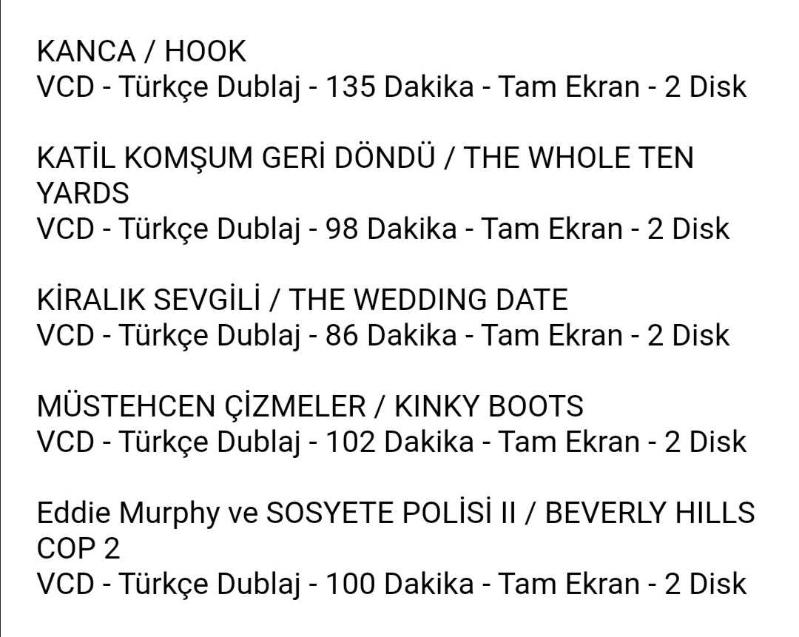 Jim Carrey ve BAŞBELASI / THE CABLE GUY DVD - Ses: İngilizce Surround, İngilizce 5.1 ve 4 Farklı Lisan - Altyazı: Türkçe ve 19 Farklı Lisan, İngilizce - 192 Dakika - 1:2.35 Geniş Versiyon - 1 Disk EN İYİ ARKADAŞIM EVLENİYOR / MY BEST FRIENDS WEDDING (Özel Tasarım Dikey Kapak) VCD - Türkçe Dublaj - 102 Dakika - Tam Ekran - 2 Disk GENÇLİK ATEŞİ 4 / BRING IT ON: IN IT TO WIN IT VCD - Türkçe Dublaj - 102 Dakika - Tam Ekran - 2 Disk HİÇ HESAPTA YOKKEN / VERY BAD THINGS (Özel Tasarım Dikey Kapak) VCD - Türkçe Dublaj - 96 Dakika - Tam Ekran - 2 Disk KANCA / HOOK VCD - Türkçe Dublaj - 135 Dakika - Tam Ekran - 2 Disk KATİL KOMŞUM GERİ DÖNDÜ / THE WHOLE TEN YARDS VCD - Türkçe Dublaj - 98 Dakika - Tam Ekran - 2 Disk KİRALIK SEVGİLİ / THE WEDDING DATE VCD - Türkçe Dublaj - 86 Dakika - Tam Ekran - 2 Disk MÜSTEHCEN ÇİZMELER / KINKY BOOTS VCD - Türkçe Dublaj - 102 Dakika - Tam Ekran - 2 Disk Eddie Murphy ve SOSYETE POLİSİ II / BEVERLY HILLS COP 2 VCD - Türkçe Dublaj - 100 Dakika - Tam Ekran - 2 Disk KARGOLAMA DUYURUSU : Kitantik.com ile anlaşmalı ve ALICI ÖDEMELİ kargo fiyatı PTT Kargo için 110.00 ₺ ‘dır.