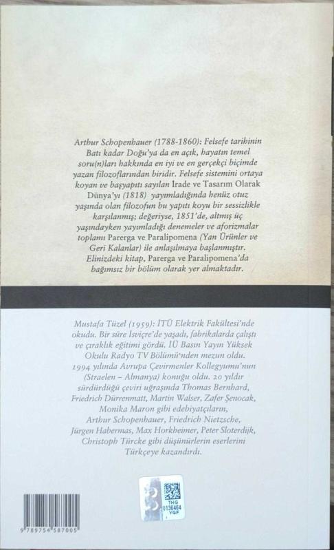 Arthur Schopenhauer (1788-1860): Felsefe tarihinin Batı kadar Doğu'ya da en açık, hayatın temel soru(n)ları hakkında en iyi ve en gerçekçi biçimde yazan filozoflarından biridir. Felsefe sistemini ortaya koyan ve başyapıtı sayılan İstenç ve Tasarım Olarak Dünya'yı (1818) yayımlandığında henüz otuz yaşında olan filozofun bu yapıtı koyu bir sessizlikle karşılanmış; değeriyse, 1851'de, altmış üç yaşındayken yayımladığı denemeler ve aforizmalar toplamı Parerga ve Paralipomena (Yan Ürünler ve Geri Kalanlar) ile anlaşılmaya başlanmıştır.