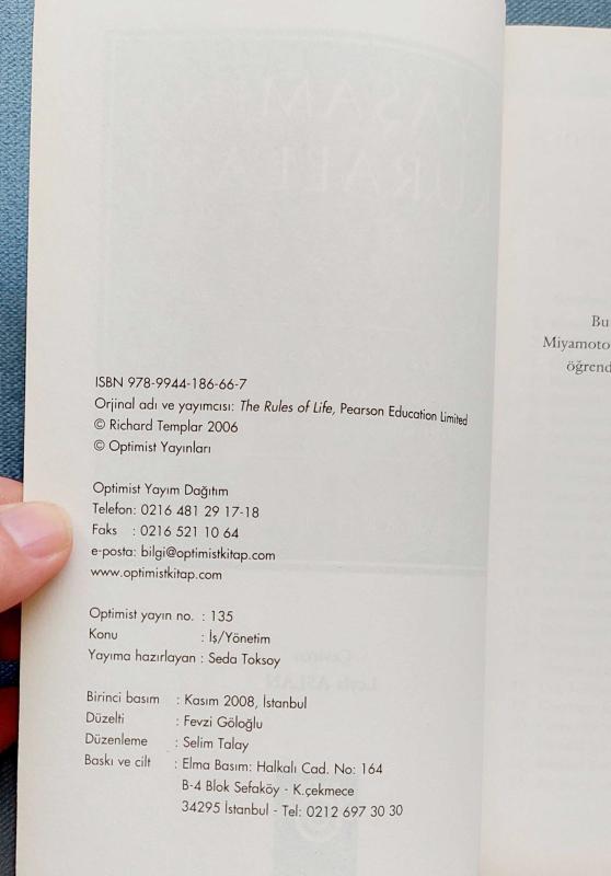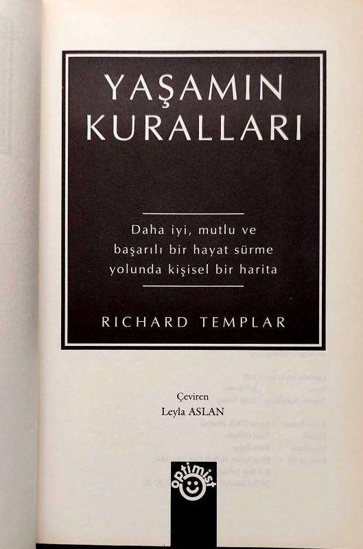 YAŞAMIN KURALLARI daha İyi, mutlu ve başarılı bir hayat sürme yolunda kişisel bir harita, RICHARD TEMPLAR tarafından kaleme alınmıştır. Kitap 2008 yılında OPTİMİST YAYIN DAĞITIM tarafından [İSTANBUL] yayınlanmıştır. Satışta olan kitap, yayınevinin 1. baskısıdır. Bu baskının çevirisi LEYLA ASLAN tarafından yapılmıştır. 235 sayfadır. YAŞAMIN KURALLARI daha İyi, mutlu ve başarılı bir hayat sürme yolunda kişisel bir harita adlı eser Türkçe dilindedir.