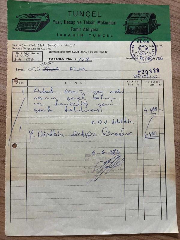 YAZI MAKİNASI BAKIM VE TEMİZLİK FATURASI - 6 HAZİRAN 1986 - TUNÇEL - YAZI, HESAP VE TEKSİR MAKİNALARI TAMİR ATÖLYESİ - İBRAHİM TUNÇEL - BEYOĞLU, İSTANBUL - OSMAN FAHİR SEDEN, O.F.S. PRODÜKSİYON - BEYOĞLU, İSTANBUL - ISLAK İMZALI, KAŞELİ - 20 x 27 cm EBATLI ORİJİNAL FATURA - TÜRK SİNEMA - FİLM TARİHİ, en son 1 yıl önce güncellenmiştir.