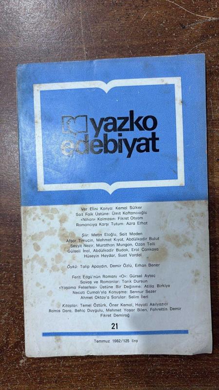 YAZKO EDEBİYAT DERGİSİ - TEMMUZ 1982 SAYI: 21 KEMAL SÜLKER - ÜMİT KAFTANCIOĞLU - FİKRET OTYAM - AZRA ERHAT - METİN ELOĞLU - SAİT MADEN - AFŞAR TİMÜÇİN - MEHMET KIYAT - ABDÜLKADİR BULUT - SEYYİT NEZİR - MURATHAN MUNGAN - OZAN TELLİ - GÜLSELİ İNAL - ABDÜLKADİR BUDAK - EROL ÇANKAYA - HÜSEYİN HAYDAR - SUAT VARDAL - TALİP APAYDIN - DEMİR ÖZLÜ - ERHAN BENER - GÜRSEL AYTAÇ - TARIK DURSUN - ATİLLA BİRKİYE - NECATİ CUMALI - SENNUR SEZER - SELİM İLERİ - AHMET OKTAY - TEMEL ÖZTÜRK - ÖNER KEMAL - HAYATİ ASILYAZICI - RAMİS DARA - BEHİÇ DUYGULU - MEHMET YAŞAR BİLEN - FAHRETTİN DEMİR - FİKRET DEMİRAĞ - HASAN İZZETTİN DİNAMO - RIFAT ILGAZ - EROL TOY - BURHAN GÜNEL - İRFAN YALÇIN - CENGİZ ÇANDAR - BİLGESU ERENUS - TURGENYEV - TRAVEN - EMMANUEL ROBLES - JACK LONDON - CHERYL DAYER MYAZKO EDEBİYAT - VER ELİNİ KONYA - SAİT FAİK ÜSTÜNE - NİHAN KALMASIN - ROMANCIYA KARŞI TUTUM - ŞİİR - ÖYKÜ - FERİT EDGÜ’NÜN ROMANI O - SAVAŞ VE ROMANLAR - YAŞAMA FELSEFESİ ÜSTÜNE BİR DEĞİNME - NECATİ CUMALI’YLA - 142 SAYFA, M.KEMAL AĞAOĞLU tarafından kaleme alınmıştır. Eser MEHMET FUAT editörlüğünde hazırlanmıştır. Kitap . tarafından [Ağaoğlu Matbaacılık] yayınlanmıştır. 142 sayfadır. YAZKO EDEBİYAT DERGİSİ - TEMMUZ 1982 SAYI: 21 KEMAL SÜLKER - ÜMİT KAFTANCIOĞLU - FİKRET OTYAM - AZRA ERHAT - METİN ELOĞLU - SAİT MADEN - AFŞAR TİMÜÇİN - MEHMET KIYAT - ABDÜLKADİR BULUT - SEYYİT NEZİR - MURATHAN MUNGAN - OZAN TELLİ - GÜLSELİ İNAL - ABDÜLKADİR BUDAK - EROL ÇANKAYA - HÜSEYİN HAYDAR - SUAT VARDAL - TALİP APAYDIN - DEMİR ÖZLÜ - ERHAN BENER - GÜRSEL AYTAÇ - TARIK DURSUN - ATİLLA BİRKİYE - NECATİ CUMALI - SENNUR SEZER - SELİM İLERİ - AHMET OKTAY - TEMEL ÖZTÜRK - ÖNER KEMAL - HAYATİ ASILYAZICI - RAMİS DARA - BEHİÇ DUYGULU - MEHMET YAŞAR BİLEN - FAHRETTİN DEMİR - FİKRET DEMİRAĞ - HASAN İZZETTİN DİNAMO - RIFAT ILGAZ - EROL TOY - BURHAN GÜNEL - İRFAN YALÇIN - CENGİZ ÇANDAR - BİLGESU ERENUS - TURGENYEV - TRAVEN - EMMANUEL ROBLES - JACK LONDON - CHERYL DAYER MYAZKO EDEBİYAT - VER ELİNİ KONYA - SAİT FAİK ÜSTÜNE - NİHAN KALMASIN - ROMANCIYA KARŞI TUTUM - ŞİİR - ÖYKÜ - FERİT EDGÜ’NÜN ROMANI O - SAVAŞ VE ROMANLAR - YAŞAMA FELSEFESİ ÜSTÜNE BİR DEĞİNME - NECATİ CUMALI’YLA - 142 SAYFA adlı eser Türkçe dilindedir.